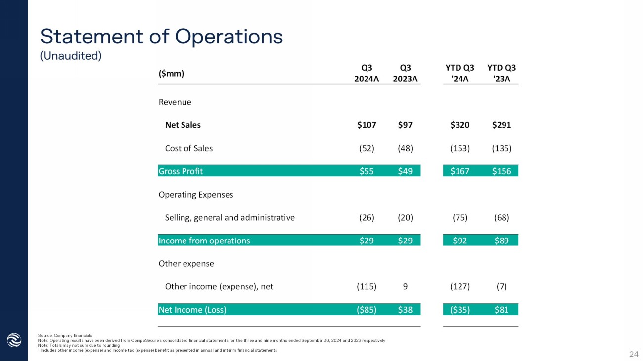 Statement of Operations (Unaudited) Source: Company financials Note: Operating results have been derived from CompoSecure’s consolidated financial statements for the three and nine months end ed September 30, 2024 and 2023 respectively Note: Totals may not sum due to rounding 1 Includes other income (expense) and income tax (expense) benefit as presented in annual and interim financial statements YTD Q3 '23A YTD Q3 '24A Q3 2023A Q3 2024A ($mm) Revenue $291 $320 $97 $107 Net Sales (135) (153) (48) (52) Cost of Sales $156 $167 $49 $55 Gross Profit Operating Expenses (68) (75) (20) (26) Selling, general and administrative $89 $92 $29 $29 Income from operations Other expense (7) (127) 9 (115) Other income (expense), net $81 ($35) $38 ($85) Net Income (Loss) 24