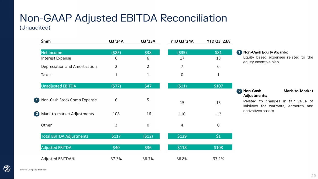 Non - GAAP Adjusted EBITDA Reconciliation (Unaudited) Source: Company financials Non - Cash Equity Awards : Equity based expenses related to the equity incentive plan Non - Cash Mark - to - Market Adjustments : Related to changes in fair value of liabilities for warrants, earnouts and derivatives assets 1 2 1 2 YTD Q3 '23A YTD Q3 '24A Q3 '23A Q3 '24A $mm $81 ($35) $38 ($85) Net Income 18 17 6 6 Interest Expense 6 7 2 2 Depreciation and Amortization 1 0 1 1 Taxes $107 ($11) $47 ($77) Unadjusted EBITDA 13 15 5 6 Non - Cash Stock Comp Expense - 12 110 - 16 108 Mark - to - market Adjustments 0 4 0 3 Other $1 $129 ($12) $117 Total EBITDA Adjustments $108 $118 $36 $40 Adjusted EBITDA 37.1% 36.8% 36.7% 37.3% Adjusted EBITDA % 25