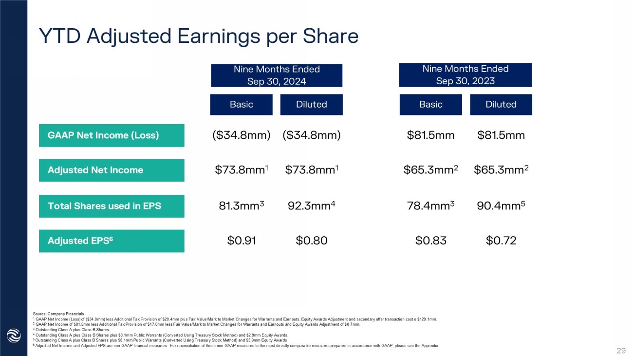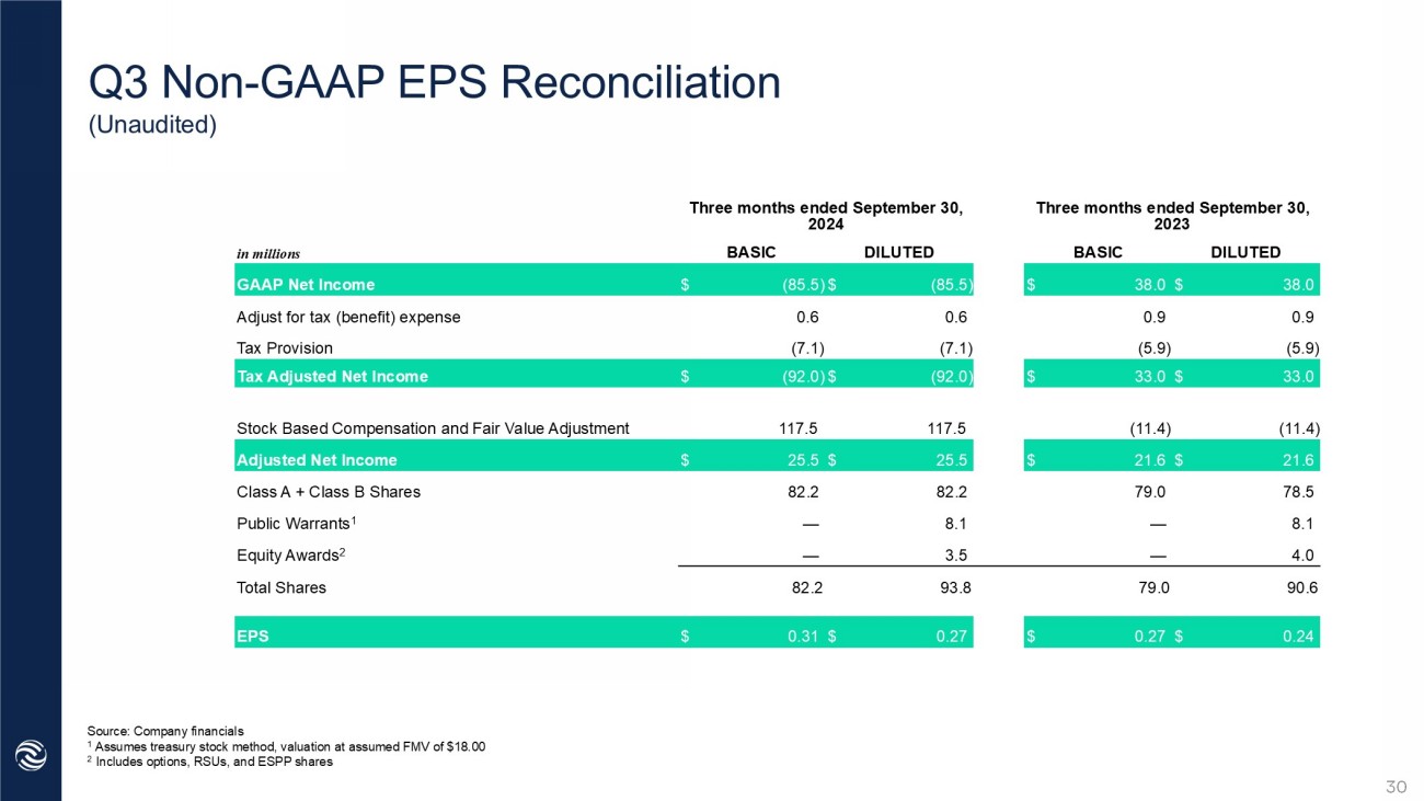 YTD Adjusted Earnings per Share 8 1 . 3 mm 3 Basic Q2 YTD ‘22 GAAP Net Income (Loss) ( $ 34 . 8 mm ) $0. 91 $ 73 . 8 mm 1 Nine M onths E nded Sep 30, 2024 Nine M onths E nded Sep 30, 2023 ( $ 34 . 8 mm ) $ 73 . 8 mm 1 9 2 . 3 mm 4 $0. 80 $ 81 . 5 mm $ 81 . 5 mm $ 65 . 3 mm 2 $ 65 . 3 mm 2 78. 4 mm 3 90. 4 mm 5 $0. 83 $0. 72 Adjusted Net Income Total Shares used in EPS Adjusted EPS 6 Diluted Basic Diluted Source: Company Financials 1 GAAP Net Income (Loss) of ( $3 4 . 8 mm ) less Additional Tax Provision of $ 20 . 4 mm plus Fair Value/Mark to Market Changes for Warrants and Earnouts, Equity Awards Adjustment and secondary offer transaction co st o $1 29 . 1 mm. 2 GAAP Net Income of $ 81 . 5 mm less Additional Tax Provision of $1 7 . 0 mm less Fair Value/Mark to Market Changes for Warrants and Earnouts and Equity Awards Adjustment of $ 0 . 7 mm. 3 Outstanding Class A plus Class B Shares. 4 Outstanding Class A plus Class B Shares plus $8.1mm Public Warrants (Converted Using Treasury Stock Method) and $2. 9 mm Equity Awards. 5 Outstanding Class A plus Class B Shares plus $8.1mm Public Warrants (Converted Using Treasury Stock Method) and $ 3 . 9 mm Equity Awards 6 Adjusted Net Income and Adjusted EPS are non - GAAP financial measures. For reconciliation of these non - GAAP measures to the most directly comparable measures prepared in accordance with GAAP, please see the Appendix 29