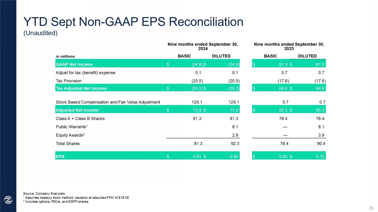 Q3 Non - GAAP EPS Reconciliation (Unaudited) Source: Company financials 1 Assumes treasury stock method, valuation at assumed FMV of $18.00 2 Includes options, RSUs, and ESPP shares Three months ended September 30, 2023 Three months ended September 30, 2024 DILUTED BASIC DILUTED BASIC in millions $ 38.0 $ 38.0 $ (85.5) $ (85.5) GAAP Net Income 0.9 0.9 0.6 0.6 Adjust for tax (benefit) expense (5.9) (5.9) (7.1) (7.1) Tax Provision $ 33.0 $ 33.0 $ (92.0) $ (92.0) Tax Adjusted Net Income (11.4) (11.4) 117.5 117.5 Stock Based Compensation and Fair Value Adjustment $ 21.6 $ 21.6 $ 25.5 $ 25.5 Adjusted Net Income 78.5 79.0 82.2 82.2 Class A + Class B Shares 8.1 — 8.1 — Public Warrants 1 4.0 — 3.5 — Equity Awards 2 90.6 79.0 93.8 82.2 Total Shares $ 0.24 $ 0.27 $ 0.27 $ 0.31 EPS 30