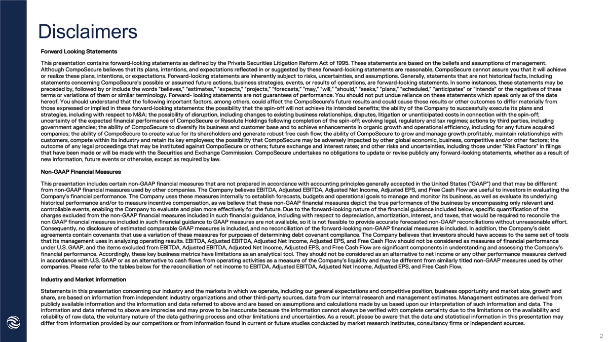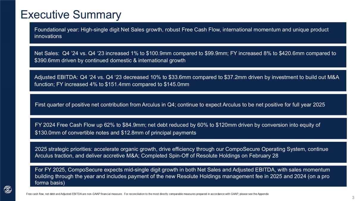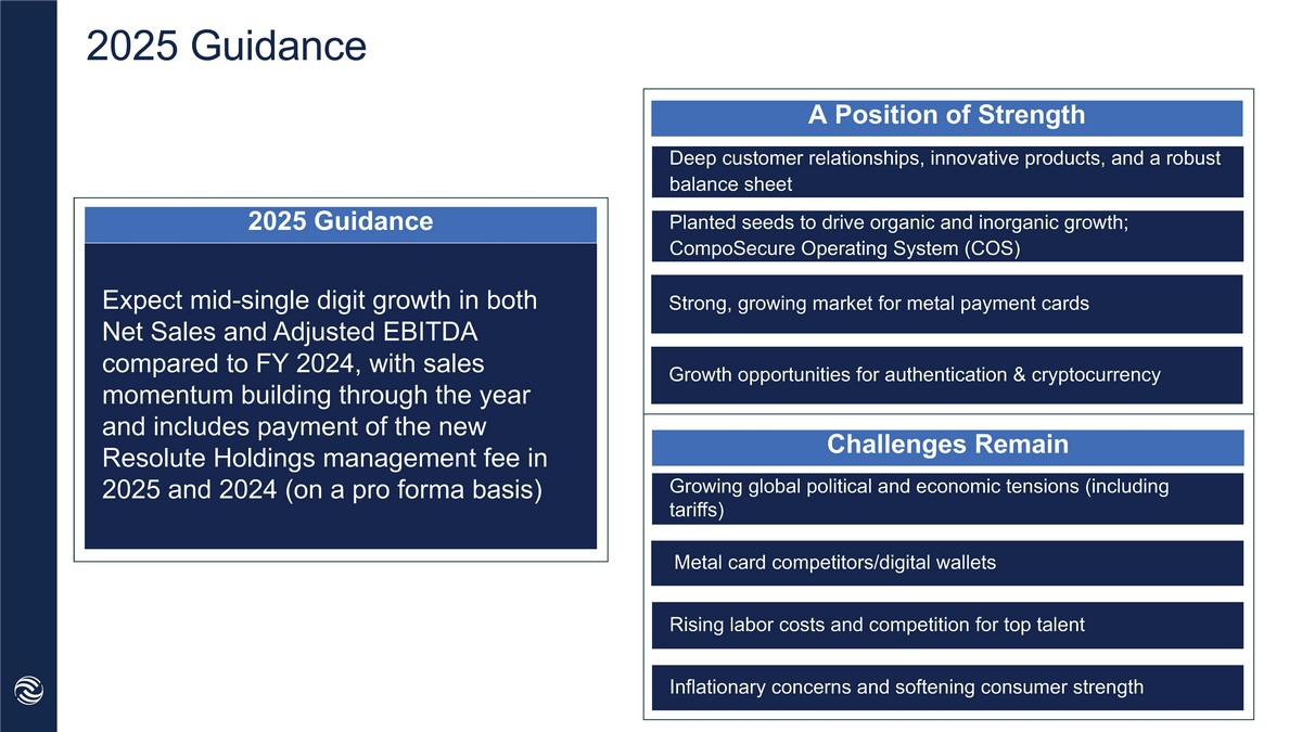 2025 Guidance Planted seeds to drive organic and inorganic growth; CompoSecure Operating System (COS) Growing global political and economic tensions (including tariffs) Metal card competitors/digital wallets Growth opportunities for authentication & cryptocurrency Rising labor costs and competition for top talent A Position of Strength Challenges Remain Deep customer relationships, innovative products, and a robust balance sheet Strong, growing market for metal payment cards Inflationary concerns and softening consumer strength Expects mid - single digit growth in both Net Sales and Adjusted EBITDA compared to FY 2024, with sales momentum building through the year and includes payment of the new Resolute Holdings management fee in 2025 and 2024 (on a pro forma basis) 2025 Guidance