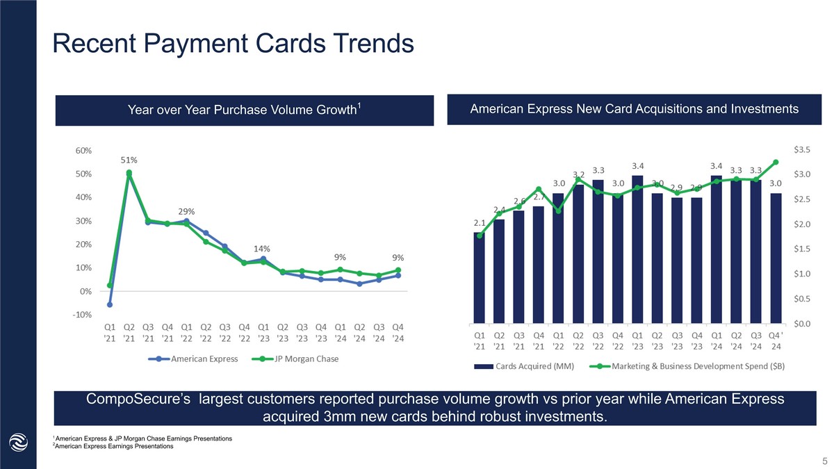Recent Trends across Payment Cards 1 American Express & JP Morgan Chase Earnings Presentations 2 American Express Earnings Presentations 5 CompoSecure’s largest customers reported purchase volume growth vs prior year while American Express acquired 3mm new cards behind robust investments. Year over Year Purchase Volume Growth 1 American Express New Card Acquisitions and Investments