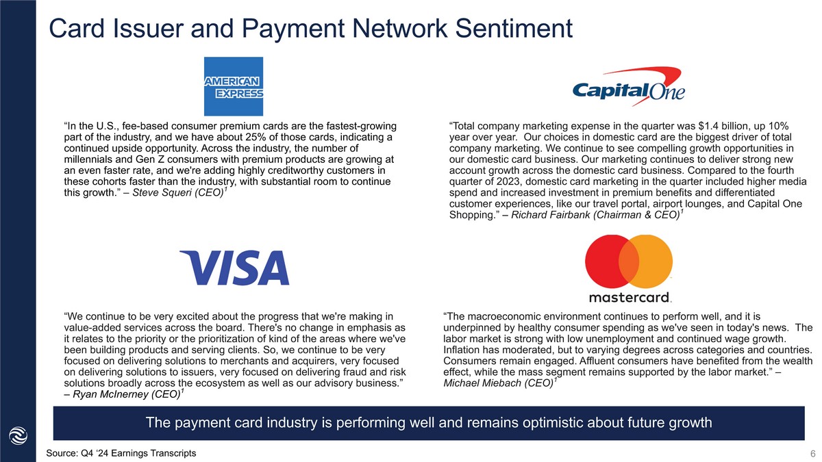Card Issuer and Payment Network Sentiment Source: Q4 ‘24 Earnings Transcripts “I n the U.S., fee - based consumer premium cards are the fastest - growing part of the industry, and we have about 25% of those cards, indicating a continued upside opportunity. Across the industry, the number of millennials and Gen Z consumers with premium products are growing at an even faster rate, and we're adding highly creditworthy customers in these cohorts faster than the industry, with substantial room to continue this growth. ” – Steve Squeri (CEO) 1 “ We continue to be very excited about the progress that we're making in value - added services across the board. There's no change in emphasis as it relates to the priority or the prioritization of kind of the areas where we've been building products and serving clients. So, we continue to be very focused on delivering solutions to merchants and acquirers, very focused on delivering solutions to issuers, very focused on delivering fraud and risk solutions broadly across the ecosystem as well as our advisory business .” – Ryan McInerney (CEO) 1 6 “Total company marketing expense in the quarter was $1.4 billion, up 10% year over year. Our choices in domestic card are the biggest driver of total company marketing. We continue to see compelling growth opportunities in our domestic card business. Our marketing continues to deliver strong new account growth across the domestic card business. Compared to the fourth quarter of 2023, domestic card marketing in the quarter included higher media spend and increased investment in premium benefits and differentiated customer experiences, like our travel portal, airport lounges, and Capital One Shopping.” – Richard Fairbank (Chairman & CEO) 1 “The macroeconomic environment continues to perform well, and it is underpinned by healthy consumer spending as we've seen in today's news. The labor market is strong with low unemployment and continued wage growth. Inflation has moderated, but to varying degrees across categories and countries. Consumers remain engaged. Affluent consumers have benefited from the wealth effect, while the mass segment remains supported by the labor market.” – Michael Miebach (CEO) 1 The payment card industry is performing well and remains optimistic about future growth