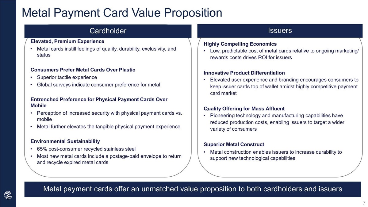 Cardholders Issuers Elevated, Premium Experience • Metal cards instill feelings of quality, durability, exclusivity, and status Consumers Prefer Metal Cards Over Plastic • Superior tactile experience • Global surveys indicate consumer preference for metal Entrenched Preference for Physical Payment Cards Over Mobile • Perception of increased security with physical payment cards vs. mobile • Metal further elevates the tangible physical payment experience Environmental Sustainability • 65% post - consumer recycled stainless steel • Most new metal cards include a postage - paid envelope to return and recycle expired metal cards Highly Compelling Economics • Low, predictable cost of metal cards relative to ongoing marketing/rewards costs drives ROI for issuers Innovative Product Differentiation • Elevated user experience and branding encourages consumers to keep issuer cards top of wallet amidst highly competitive payment card market Quality Offering for Mass Affluent • Pioneering technology and manufacturing capabilities have reduced production costs, enabling issuers to target a wider variety of consumers Superior Metal Construct • Metal construction enables issuers to increase durability to support new technological capabilities Metal Payment Card’s Value Proposition 7 Metal payment cards offer an unmatched value proposition to both cardholders and issuers Cardholder Issuers