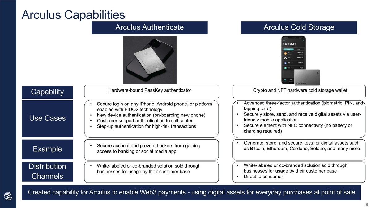 Arculus Capabilities Hardware - bound PassKey authenticator • Secure login on any iPhone, Android phone, or platform enabled with FIDO2 technology • New device authentication (on - boarding new phone) • Customer support authentication to call center • Step - up authentication for high - risk transactions • Secure account and prevent hackers from gaining access to banking or social media app • White - labeled or co - branded solution sold through businesses for usage by their customer base • Generate, store, and secure keys for digital assets such as Bitcoin, Ethereum, Cardano, Solano, and many more • White - labeled or co - branded solution sold through businesses for usage by their customer base • Direct to consumer Crypto and NFT hardware cold storage wallet • Advanced three - factor authentication (biometric, PIN, and tapping card) • Securely store, send, and receive digital assets via user - friendly mobile application • Secure element with NFC connectivity (no battery or charging required) 8 Created capability for Arculus to enable Web3 payments - using digital assets for everyday purchases at point of sale Arculus Authenticate Arculus Cold Storage Capability Use Cases Example Distribution Channels