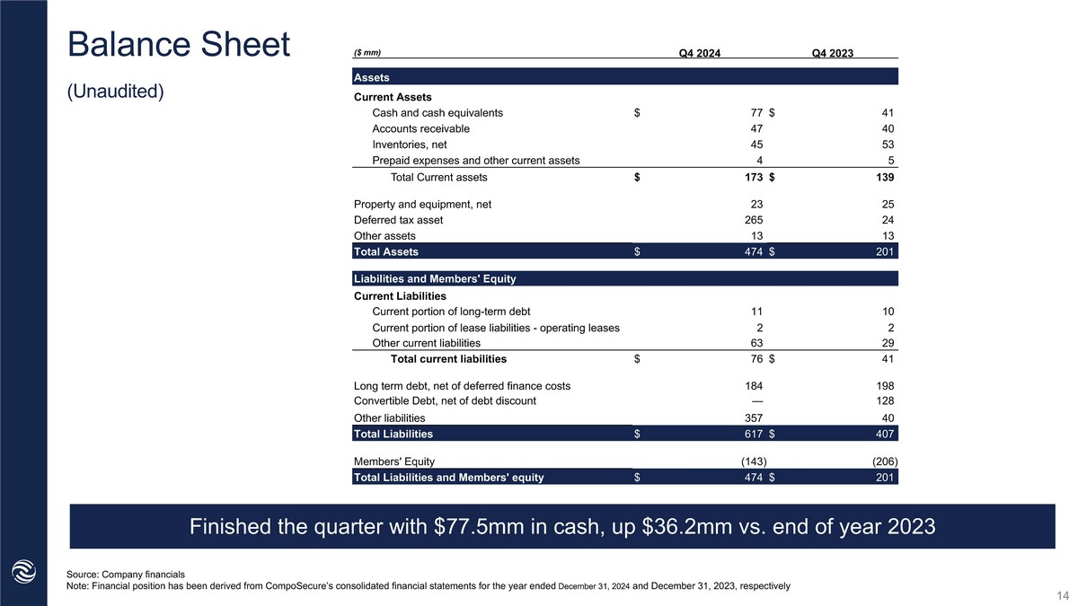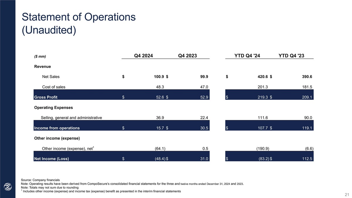 Statement of Operations (Unaudited) Source: Company financials Note: Operating results have been derived from CompoSecure’s consolidated financial statements for the three and twelve months ended December 31, 2024 and 2023 . Note: Totals may not sum due to rounding 1 Includes other income (expense) and income tax (expense) benefit as presented in the interim financial statements YTD Q4 '23 YTD Q4 '24 Q4 2023 Q4 2024 ($ mm) Revenue $ 390.6 $ 420.6 $ 99.9 $ 100.9 Net Sales 181.5 201.3 47.0 48.3 Cost of sales $ 209.1 $ 219.3 $ 52.9 $ 52.6 Gross Profit Operating Expenses 90.0 111.6 22.4 36.9 Selling, general and administrative $ 119.1 $ 107.7 $ 30.5 $ 15.7 Income from operations Other income (expense) (6.6) (190.8) 0.5 (64.0) Other income (expense), net 1 $ 112.5 $ (83.1) $ 31.0 $ (48.3) Net Income (Loss) 21