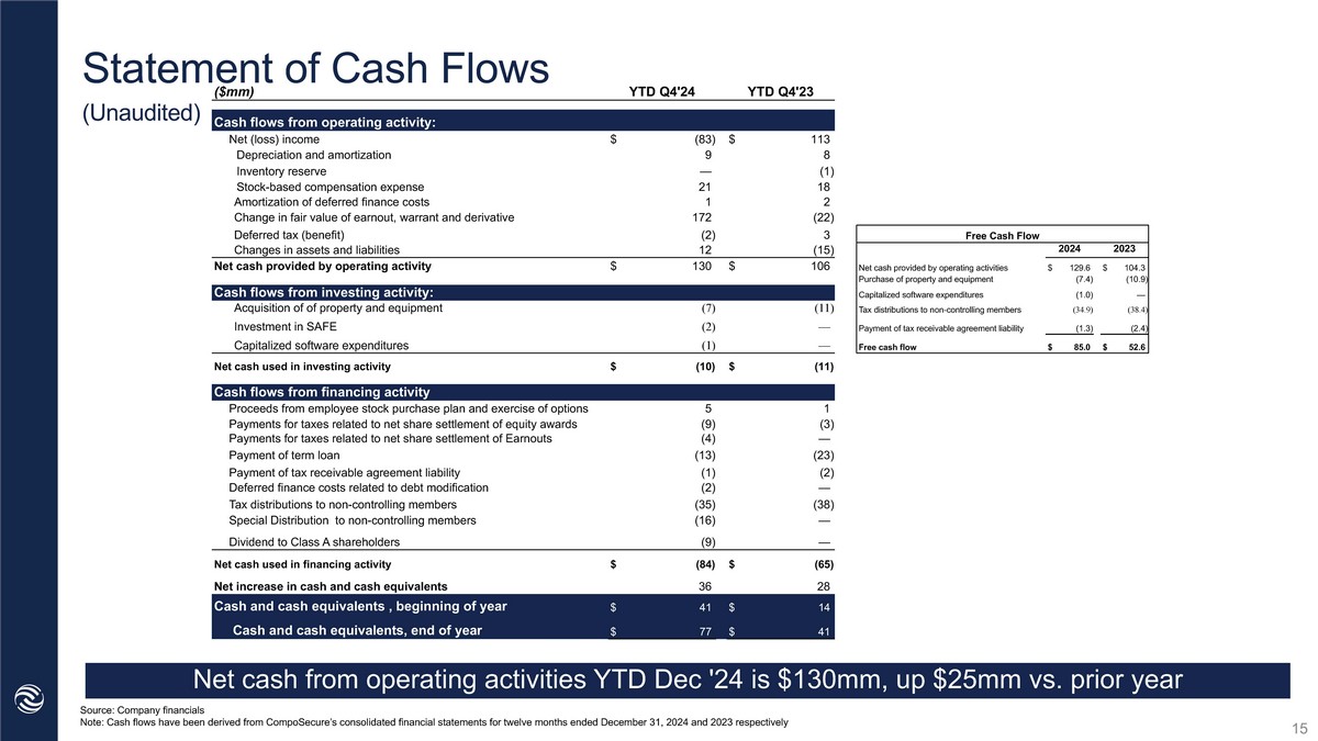 Balance Sheet (Unaudited) Source: Company financials Note: Financial position has been derived from CompoSecure’s consolidated financial statements for the year ended December 31, 2024 and December 31, 2023, respectively Q4 2023 Q4 2024 ($ mm) Assets Current Assets $ 41 $ 77 Cash and cash equivalents 40 47 Accounts receivable 53 45 Inventories, net 5 4 Prepaid expenses and other current assets $ 139 $ 173 Total Current assets 25 23 Property and equipment, net 24 265 Deferred tax asset 13 12 Other assets $ 201 $ 473 Total Assets Liabilities and Members' Equity Current Liabilities 10 11 Current portion of long - term debt 2 2 Current portion of lease liabilities - operating leases 29 63 Other current liabilities $ 41 $ 76 Total current liabilities 198 184 Long term debt, net of deferred finance costs 128 — Convertible Debt, net of debt discount 40 357 Other liabilities $ 407 $ 617 Total Liabilities (206) (143) Members' Equity $ 201 $ 474 Total Liabilities and Members' equity 14 Finished the quarter with $77.5mm in cash, up $36.2mm vs. end of year 2023