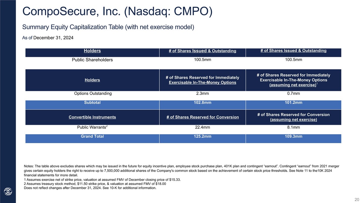 CompoSecure, Inc. (Nasdaq: CMPO) Summary Equity Capitalization Table (with net exercise model) As of December 31, 2024 # of Shares Issued & Outstanding # of Shares Issued & Outstanding Holders 100.5mm 100.5mm Public Shareholders # of Shares Reserved for Immediately Exercisable In - The - Money Options (assuming net exercise) 1 # of Shares Reserved for Immediately Exercisable In - The - Money Options Holders 0.7mm 2.3mm Options Outstanding 101.2mm 102.8mm Subtotal # of Shares Reserved for Conversion (assuming net exercise) # of Shares Reserved for Conversion Convertible Instruments 8.1mm 22.4mm Public Warrants 2 109.3mm 125.2mm Grand Total Notes: The table above excludes shares which may be issued in the future for equity incentive plan, employee stock purchase p lan , 401K plan and contingent “earnout”. Contingent “earnout” from 2021 merger gives certain equity holders the right to receive up to 7,500,000 additional shares of the Company's common stock based on th e a chievement of certain stock price thresholds. See Note 11 to the10K 2024 financial statements for more detail. 1 Assumes exercise net of strike price, valuation at assumed FMV of December closing price of $15.33. 2 Assumes treasury stock method, $11.50 strike price, & valuation at assumed FMV of $18.00 Does not reflect changes after December 31, 2024. See 10 - K for additional information. 20