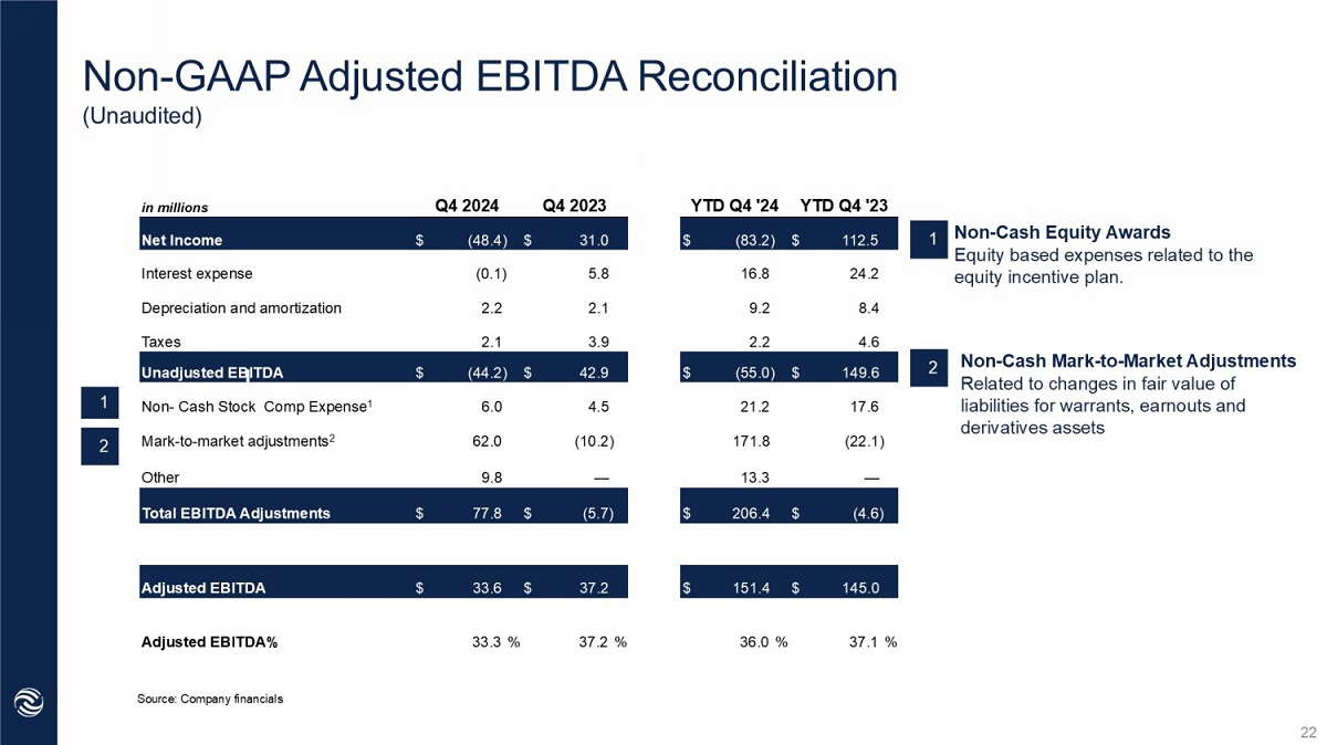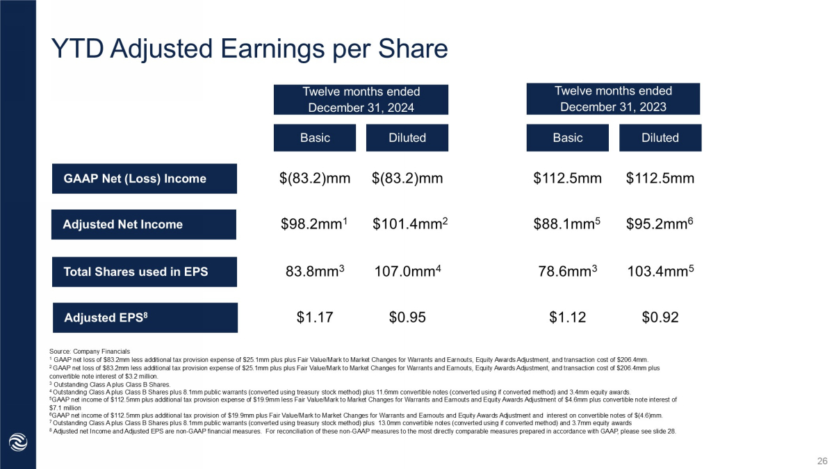 Q4 Adjusted Earnings per Share 91.4mm 3 Basic Q2 YTD ‘22 GAAP Net Income (Loss) $(48.4)mm $0.27 $24.7mm Three months ended December 31, 2024 Three months ended December 31, 2023 $(48.4)mm $22.6mm 1 110.2mm 4 $0.20 $31.0mm $31.0mm $22.8mm $24.6mm 2 79.3mm 103.4mm 5 $0.29 $0.24 Adjusted Net Income Total Shares used in EPS Adjusted EPS 6 Diluted Basic Diluted Source: Company Financials 1 GAAP Net Income(Loss) of $(48.4)mm plus additional tax provision of $(4.7)mm plus Fair Value/Mark to Market Changes for Warra nt s and Earnouts, Equity Awards Adjustment, interest on convertible notes and transaction cost of $75.6mm. 2 GAAP Net Income of $31.0mm plus additional tax provision of $(2.5)mm plus Fair Value/Mark to Market Changes for Warrants and E arnouts, Equity Awards Adjustment, interest on convertible notes and transaction cost of $(3.9)mm. 3 Outstanding Class A plus Class B Shares. 4 Outstanding Class A plus Class B Shares plus 8.1mm Public Warrants (converted using treasury stock method) plus 5.8mm convert ib le notes (converted using if converted method) and 4.9mm equity awards. 5 Outstanding Class A plus Class B Shares plus $8.1mm Public Warrants (converted using treasury stock method) plus 13.0mm conv ert ible notes (converted using if converted method) and 3.0mm equity awards 6 Adjusted Net Income and Adjusted EPS are non - GAAP financial measures. For reconciliation of these non - GAAP measures to the most directly comparable measures prepared in accordance with GAAP, please see the Appendix. 24