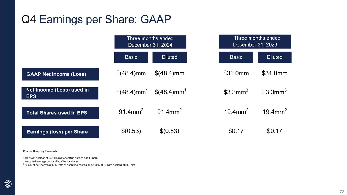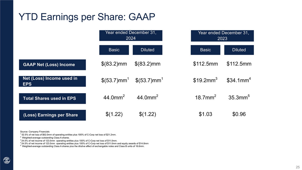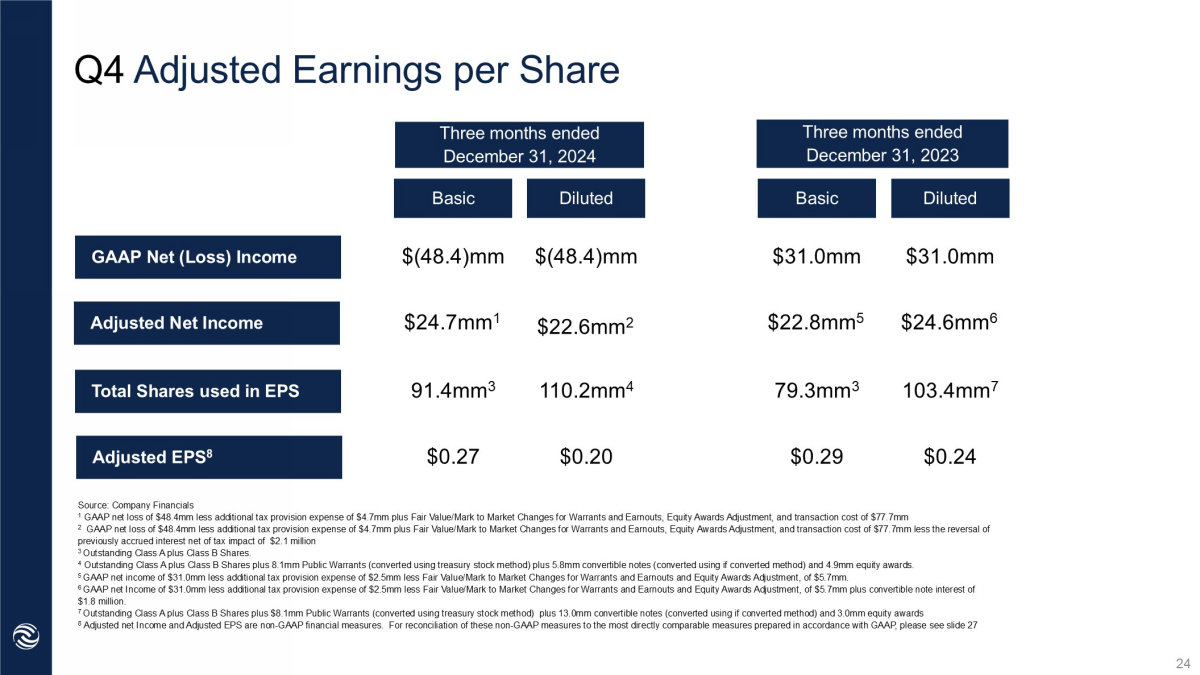 Q4 Earnings per Share: GAAP 91.4mm 3 Basic Q2 YTD ‘22 GAAP Net Income (Loss) $(48.4)mm $(0.53) $(48.4)mm 1 Three months ended December 31, 2024 Three months ended December 31, 2023 $(48.4)mm $(48.4)mm 2 91.4mm 4 $(0.53) $31.0mm $31.0mm $3.3mm $3.3mm 19.4mm 19.4mm $0.17 $0.17 Net Income (Loss) used in EPS Total Shares used in EPS Earnings (loss) per Share Diluted Basic Diluted Source: Company Financials 1 100% of Net Income (Loss) of $(48.4)mm of operating entities and C - Corp. 2 100% of Net Income (Loss) of $(48.4)mm of operating entities and C - Corp. 3 Weighted - average outstanding Class A Shares. 4 Weighted - average outstanding Class A Shares. 23
