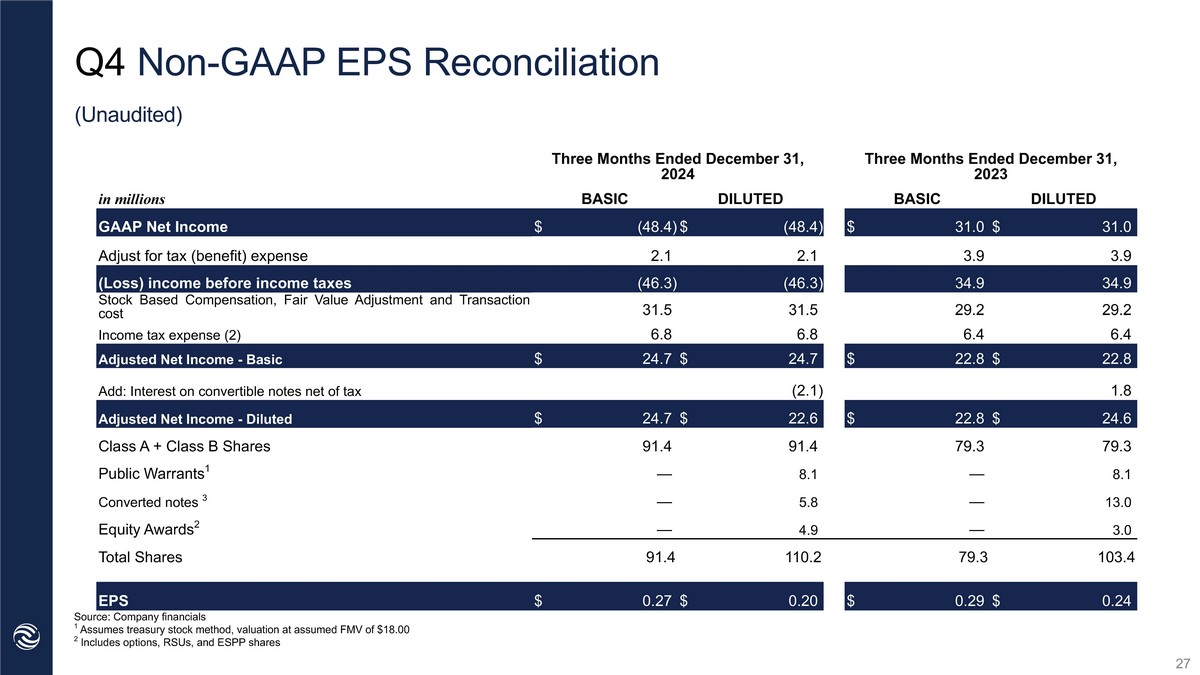 YTD Adjusted Earnings per Share 83.8mm 3 Basic Q2 YTD ‘22 GAAP Net Income (Loss) $(83.2)mm $1.17 $98.2mm Twelve months ended December 31, 2024 Twelve months ended December 31, 2023 $(83.2)mm $101.4mm 1 107.0mm 4 $0.95 $112.5mm $112.5mm $88.1mm 2 $95.2mm 2 78.6mm 3 103.4mm 5 $1.12 $0.92 Adjusted Net Income Total Shares used in EPS Adjusted EPS 6 Diluted Basic Diluted Source: Company Financials 1 GAAP Net income (Loss) of $(83.2)mm less additional tax provision of $25.1mm plus plus Fair Value/Mark to Market Changes for Wa rrants and Earnouts, Equity Awards Adjustment, interest on convertible notes and transaction cost of $209.6mm. .2 GAAP Net Income of $112.5mm plus additional tax provision of $19.9mm plus Fair Value/Mark to Market Changes for Warrants and Ea rnouts and Equity Awards Adjustment and interest on convertible notes of $2.5mm. 3 Outstanding Class A plus Class B Shares. 4 Outstanding Class A plus Class B Shares plus 8.1mm public warrants (converted using treasury stock method) plus 11.6mm conver tib le notes (converted using if converted method) and 3.4mm equity awards. 5 Outstanding Class A plus Class B Shares plus 8.1mm public warrants (converted using treasury stock method) plus 13.0mm conve rti ble notes (converted using if converted method) and 3.7mm equity awards 6 Adjusted Net Income and Adjusted EPS are non - GAAP financial measures. For reconciliation of these non - GAAP measures to the most directly comparable measures prepared in accordance with GAAP, please see the Appendix. 26