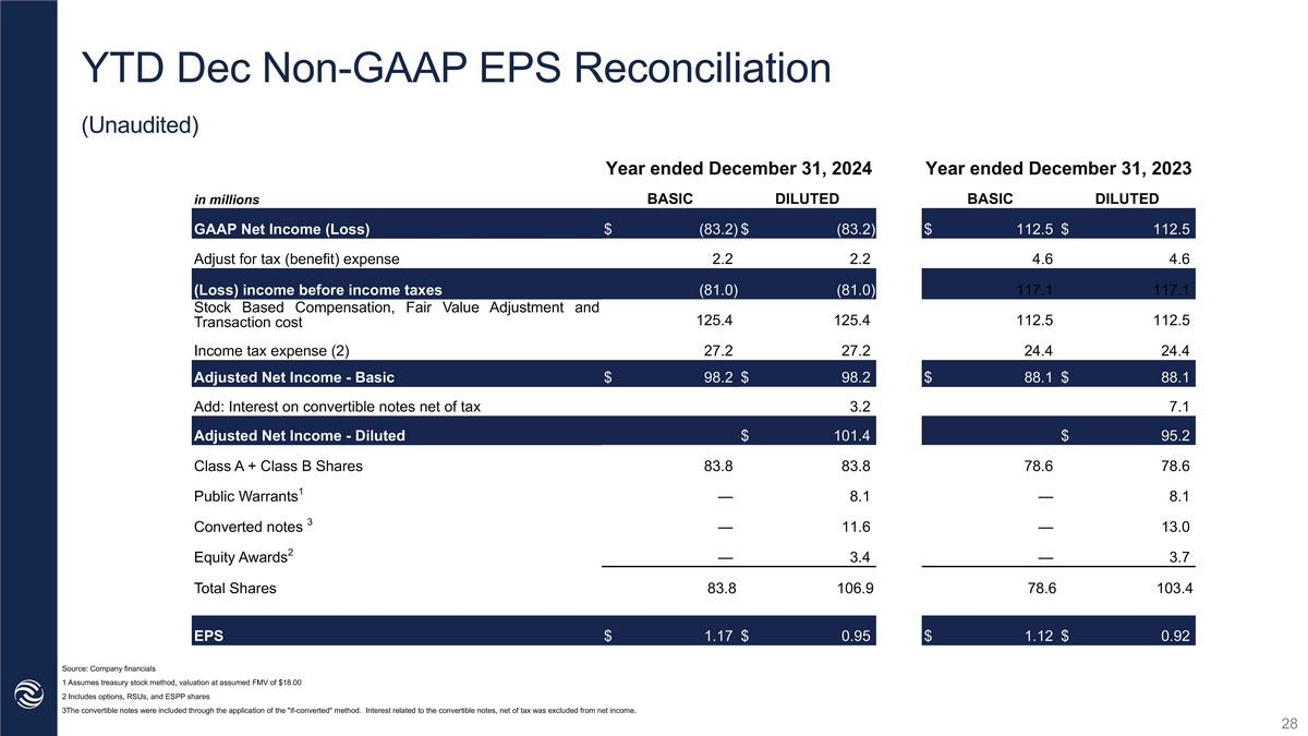 Q4 Non - GAAP EPS Reconciliation (Unaudited) Source: Company financials 1 Assumes treasury stock method, valuation at assumed FMV of $18.00 2 Includes options, RSUs, and ESPP shares Three Months Ended December 31, 2023 Three Months Ended December 31, 2024 DILUTED BASIC DILUTED BASIC in millions $ 31.0 $ 31.0 $ (48.4) $ (48.4) GAAP Net Income 3.9 3.9 2.1 2.1 Adjust for tax (benefit) expense 34.9 34.9 (46.3) (46.3) (Loss) income before income taxes 29.2 29.2 31.5 31.5 Stock Based Compensation, Fair Value Adjustment and Transaction cost 6.4 6.4 6.8 6.8 Income tax expense ( 2 ) $ 22.8 $ 22.8 $ 24.7 $ 24.7 Adjusted Net Income - Basic 1.8 (2.1) Add : Interest on convertible notes net of tax $ 24.6 $ 22.8 $ 22.6 $ 24.7 Adjusted Net Income - Diluted 79.3 79.3 91.4 91.4 Class A + Class B Shares 8.1 — 8.1 — Public Warrants 1 13.0 — 5.8 — Converted notes 3 3.0 — 4.9 — Equity Awards 2 103.4 79.3 110.2 91.4 Total Shares $ 0.24 $ 0.29 $ 0.20 $ 0.27 EPS 27