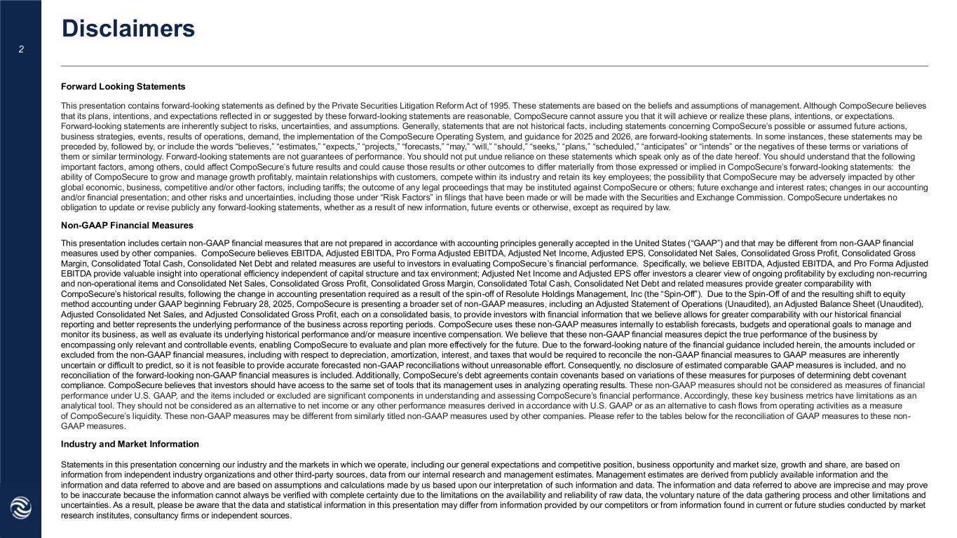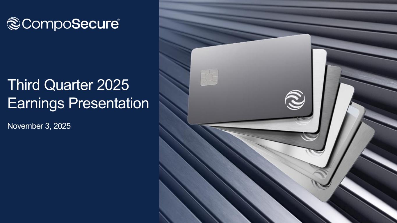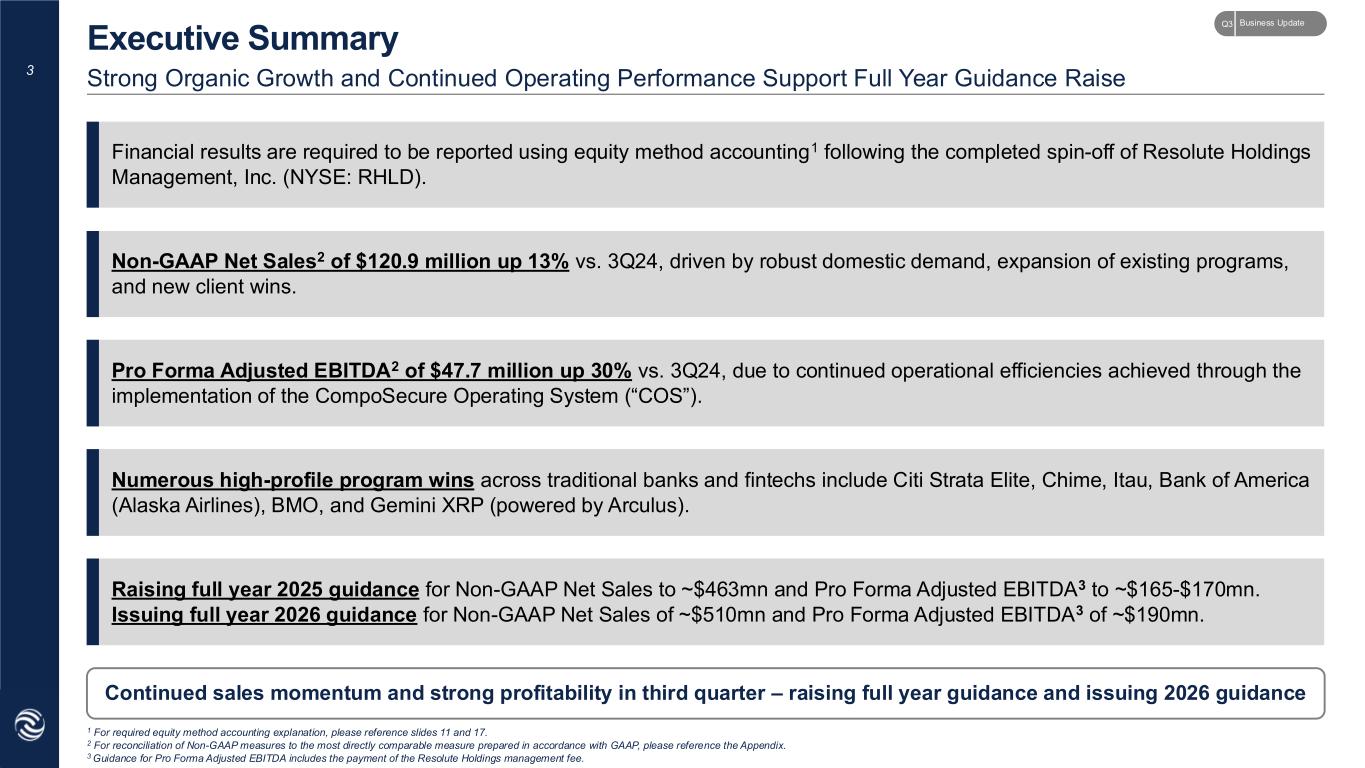 2 Forward Looking Statements This presentation contains forward-looking statements as defined by the Private Securities Litigation Reform Act of 1995. These statements are based on the beliefs and assumptions of management. Although CompoSecure believes that its plans, intentions, and expectations reflected in or suggested by these forward-looking statements are reasonable, CompoSecure cannot assure you that it will achieve or realize these plans, intentions, or expectations. Forward-looking statements are inherently subject to risks, uncertainties, and assumptions. Generally, statements that are not historical facts, including statements concerning CompoSecure’s possible or assumed future actions, business strategies, events, results of operations, demand, the implementation of the CompoSecure Operating System, and guidance for 2025 and 2026, are forward-looking statements. In some instances, these statements may be preceded by, followed by, or include the words “believes,” “estimates,” “expects,” “projects,” “forecasts,” “may,” “will,” “should,” “seeks,” “plans,” “scheduled,” “anticipates” or “intends” or the negatives of these terms or variations of them or similar terminology. Forward-looking statements are not guarantees of performance. You should not put undue reliance on these statements which speak only as of the date hereof. You should understand that the following important factors, among others, could affect CompoSecure’s future results and could cause those results or other outcomes to differ materially from those expressed or implied in CompoSecure’s forward-looking statements: the ability of CompoSecure to grow and manage growth profitably, maintain relationships with customers, compete within its industry and retain its key employees; the possibility that CompoSecure may be adversely impacted by other global economic, business, competitive and/or other factors, including tariffs; the outcome of any legal proceedings that may be instituted against CompoSecure or others; future exchange and interest rates; changes in our accounting and/or financial presentation; and other risks and uncertainties, including those under “Risk Factors” in filings that have been made or will be made with the Securities and Exchange Commission. CompoSecure undertakes no obligation to update or revise publicly any forward-looking statements, whether as a result of new information, future events or otherwise, except as required by law. Non-GAAP Financial Measures This presentation includes certain non-GAAP financial measures that are not prepared in accordance with accounting principles generally accepted in the United States (“GAAP”) and that may be different from non-GAAP financial measures used by other companies. CompoSecure believes EBITDA, Adjusted EBITDA, Pro Forma Adjusted EBITDA, Adjusted Net Income, Adjusted EPS, Consolidated Net Sales, Consolidated Gross Profit, Consolidated Gross Margin, Consolidated Total Cash, Consolidated Net Debt and related measures are useful to investors in evaluating CompoSecure’s financial performance. Specifically, we believe EBITDA, Adjusted EBITDA, and Pro Forma Adjusted EBITDA provide valuable insight into operational efficiency independent of capital structure and tax environment; Adjusted Net Income and Adjusted EPS offer investors a clearer view of ongoing profitability by excluding non-recurring and non-operational items and Consolidated Net Sales, Consolidated Gross Profit, Consolidated Gross Margin, Consolidated Total Cash, Consolidated Net Debt and related measures provide greater comparability with CompoSecure’s historical results, following the change in accounting presentation required as a result of the spin-off of Resolute Holdings Management, Inc (the “Spin-Off”). Due to the Spin-Off of and the resulting shift to equity method accounting under GAAP beginning February 28, 2025, CompoSecure is presenting a broader set of non-GAAP measures, including an Adjusted Statement of Operations (Unaudited), an Adjusted Balance Sheet (Unaudited), Adjusted Consolidated Net Sales, and Adjusted Consolidated Gross Profit, each on a consolidated basis, to provide investors with financial information that we believe allows for greater comparability with our historical financial reporting and better represents the underlying performance of the business across reporting periods. CompoSecure uses these non-GAAP measures internally to establish forecasts, budgets and operational goals to manage and monitor its business, as well as evaluate its underlying historical performance and/or measure incentive compensation. We believe that these non-GAAP financial measures depict the true performance of the business by encompassing only relevant and controllable events, enabling CompoSecure to evaluate and plan more effectively for the future. Due to the forward-looking nature of the financial guidance included herein, the amounts included or excluded from the non-GAAP financial measures, including with respect to depreciation, amortization, interest, and taxes that would be required to reconcile the non-GAAP financial measures to GAAP measures are inherently uncertain or difficult to predict, so it is not feasible to provide accurate forecasted non-GAAP reconciliations without unreasonable effort. Consequently, no disclosure of estimated comparable GAAP measures is included, and no reconciliation of the forward-looking non-GAAP financial measures is included. Additionally, CompoSecure’s debt agreements contain covenants based on variations of these measures for purposes of determining debt covenant compliance. CompoSecure believes that investors should have access to the same set of tools that its management uses in analyzing operating results. These non-GAAP measures should not be considered as measures of financial performance under U.S. GAAP, and the items included or excluded are significant comp