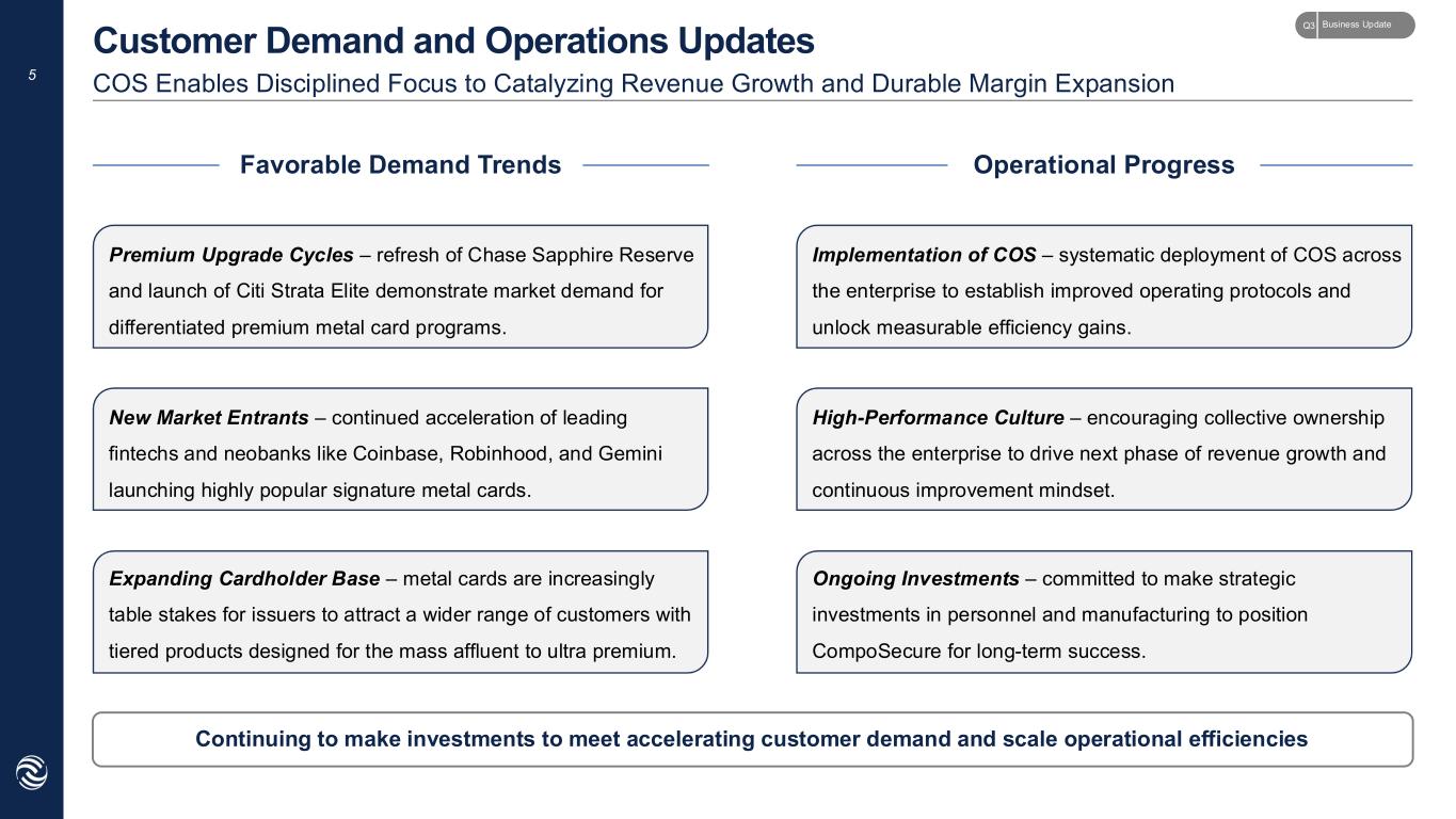 4 CMPO is an operating business and RHLD is an asset management firm – Non-GAAP financials capture distinct economics Non-GAAP Financials Best Reflect Underlying Entity Structure and Unique Earnings Streams Relationship Between CMPO & RHLD CompoSecure, Inc. (NYSE: CMPO) Resolute Holdings Management, Inc. (NYSE: RHLD) CompoSecure Holdings, L.L.C. (“Holdings”) 100% Ownership Quarterly Management Fee1 Non-GAAP Financials Non-GAAP Financials Traditional Operating Results Minus: Management Fee Paid to RHLD Equals: CMPO Operating Earnings Management Fee from CompoSecure Minus: Salaries and Operating Expenses Equals: RHLD Fee-Related Earnings 1 For detailed calculation of quarterly management fee as reported by CMPO and as defined by the management agreement, please reference slide 22 in the Appendix. Business UpdateQ3
