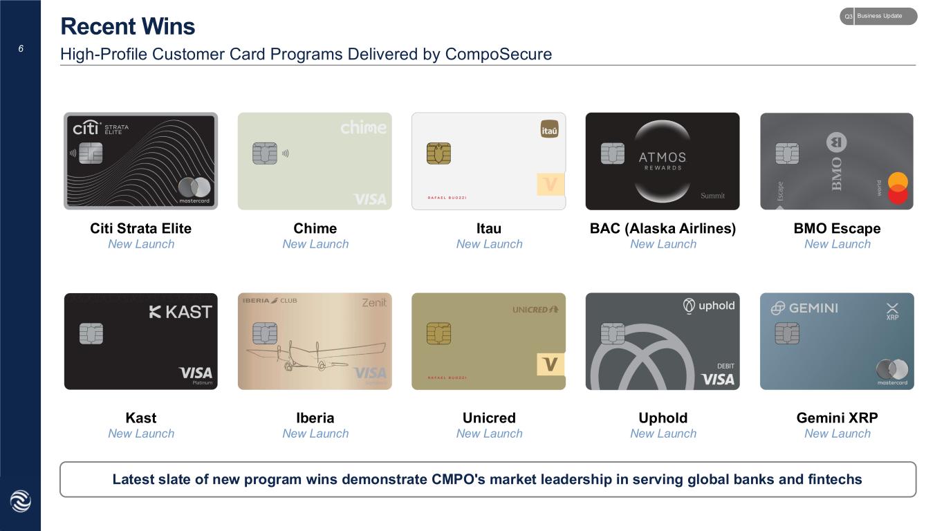 5 Continuing to make investments to meet accelerating customer demand and scale operational efficiencies Favorable Demand Trends Operational Progress Premium Upgrade Cycles – refresh of Chase Sapphire Reserve and launch of Citi Strata Elite demonstrate market demand for differentiated premium metal card programs. New Market Entrants – continued acceleration of leading fintechs and neobanks like Coinbase, Robinhood, and Gemini launching highly popular signature metal cards. Expanding Cardholder Base – metal cards are increasingly table stakes for issuers to attract a wider range of customers with tiered products designed for the mass affluent to ultra premium. Implementation of COS – systematic deployment of COS across the enterprise to establish improved operating protocols and unlock measurable efficiency gains. High-Performance Culture – encouraging collective ownership across the enterprise to drive next phase of revenue growth and continuous improvement mindset. Ongoing Investments – committed to make strategic investments in personnel and manufacturing to position CompoSecure for long-term success. COS Enables Disciplined Focus to Catalyzing Revenue Growth and Durable Margin Expansion Customer Demand and Operations Updates Business UpdateQ3
