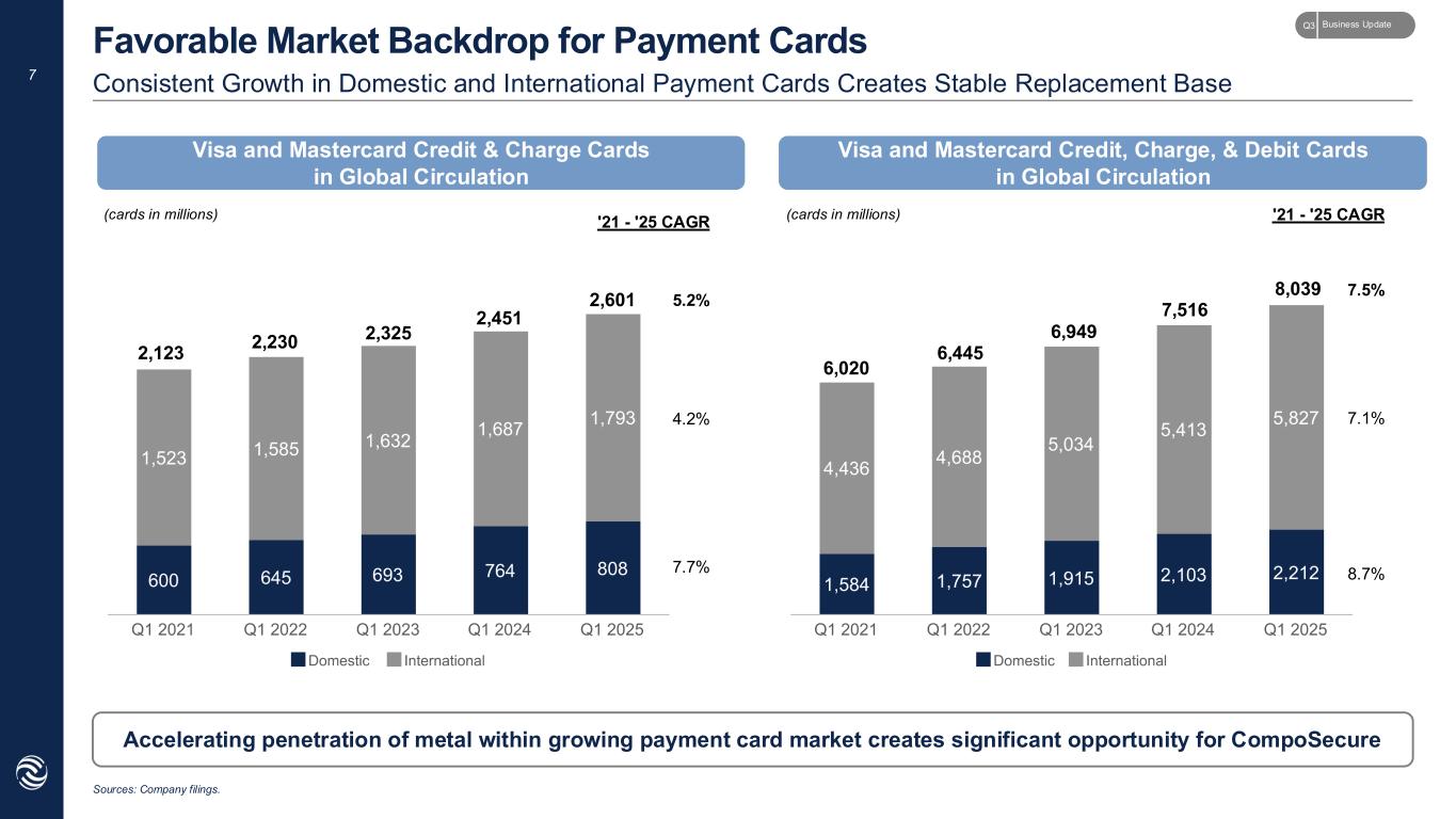 6 Citi Strata Elite New Launch Itau New Launch BAC (Alaska Airlines) New Launch BMO Escape New Launch Unicred New Launch Kast New Launch High-Profile Customer Card Programs Delivered by CompoSecure Recent Wins Latest slate of new program wins demonstrate CMPO's market leadership in serving global banks and fintechs Uphold New Launch Gemini XRP New Launch Chime New Launch Iberia New Launch Business UpdateQ3