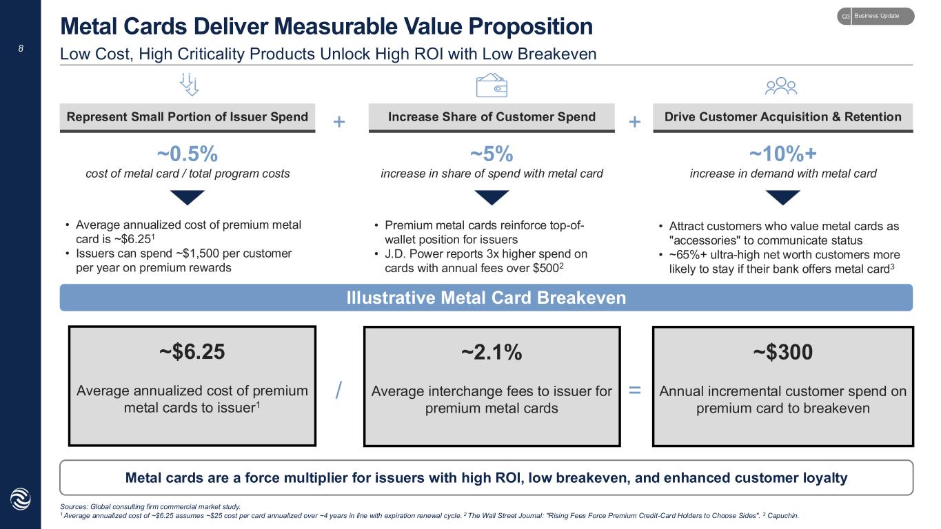 7 Sources: Company filings. Accelerating penetration of metal within growing payment card market creates significant opportunity for CompoSecure Visa and Mastercard Credit & Charge Cards in Global Circulation '21 - '25 CAGR Consistent Growth in Domestic and International Payment Cards Creates Stable Replacement Base Favorable Market Backdrop for Payment Cards 5.2% 4.2% 7.7% Visa and Mastercard Credit, Charge, & Debit Cards in Global Circulation '21 - '25 CAGR 7.5% 7.1% 8.7% (cards in millions) (cards in millions) 2,123 2,230 2,325 2,451 2,601 6,020 6,445 6,949 7,516 8,039 Business UpdateQ3