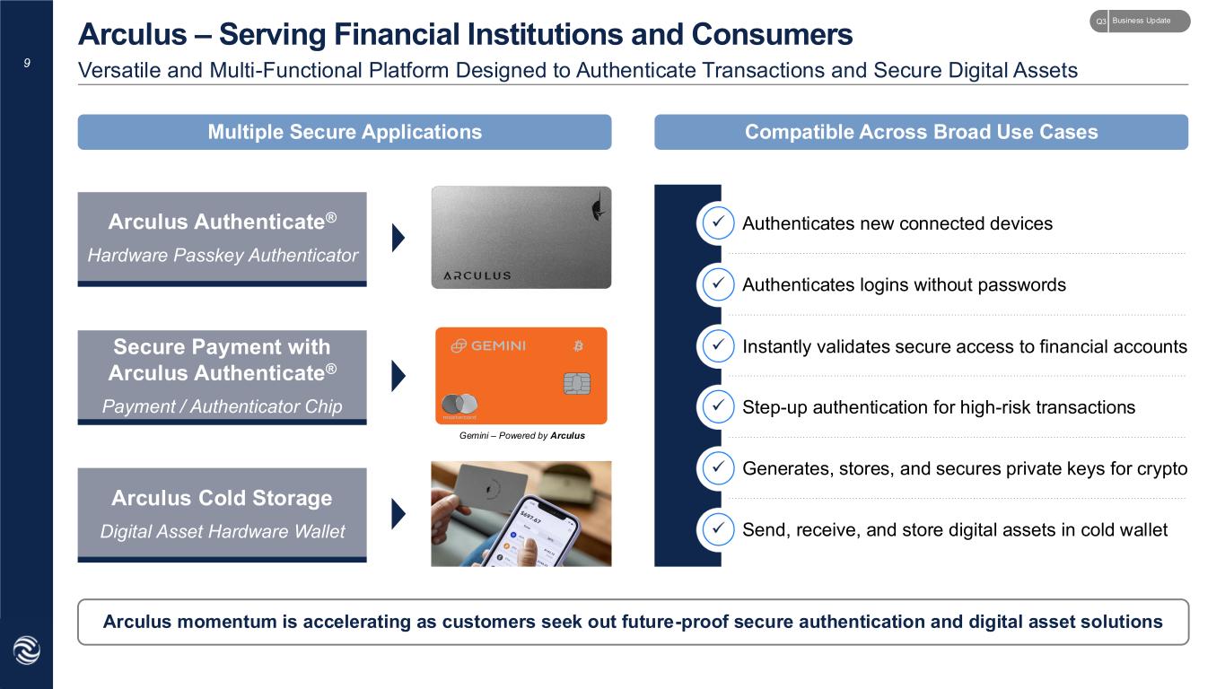 8 Sources: Global consulting firm commercial market study. 1 Average annualized cost of ~$6.25 assumes ~$25 cost per card annualized over ~4 years in line with expiration renewal cycle. 2 The Wall Street Journal: "Rising Fees Force Premium Credit-Card Holders to Choose Sides". 3 Capuchin. Metal cards are a force multiplier for issuers with high ROI, low breakeven, and enhanced customer loyalty Low Cost, High Criticality Products Unlock High ROI with Low Breakeven Metal Cards Deliver Measurable Value Proposition Illustrative Metal Card Breakeven ~2.1% Average interchange fees to issuer for premium metal cards ~$300 Annual incremental customer spend on premium card to breakeven ~$6.25 Average annualized cost of premium metal cards to issuer1 / = Represent Small Portion of Issuer Spend Increase Share of Customer Spend Drive Customer Acquisition & Retention+ + ~0.5% cost of metal card / total program costs • Average annualized cost of premium metal card is ~$6.251 • Issuers can spend ~$1,500 per customer per year on premium rewards ~5% increase in share of spend with metal card • Premium metal cards reinforce top-of- wallet position for issuers • J.D. Power reports 3x higher spend on cards with annual fees over $5002 ~10%+ increase in demand with metal card • Attract customers who value metal cards as "accessories" to communicate status • ~65%+ ultra-high net worth customers more likely to stay if their bank offers metal card3 Business UpdateQ3