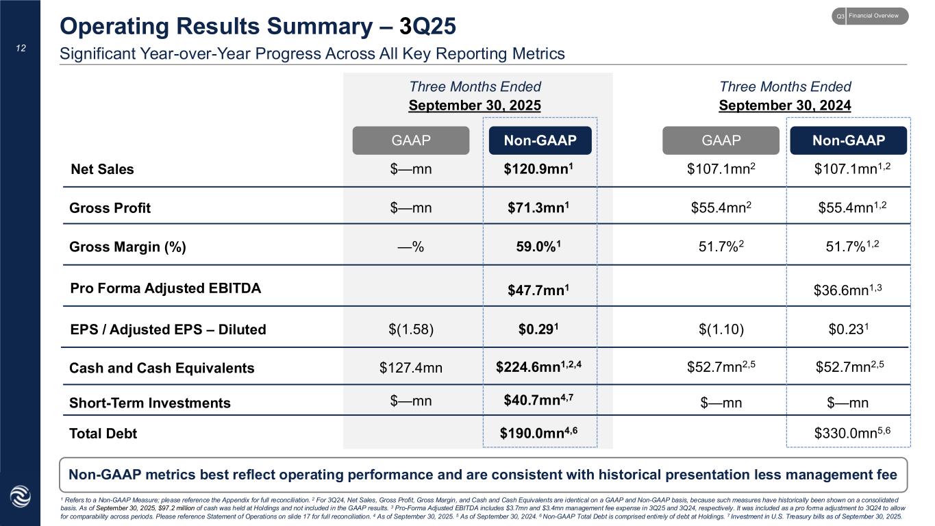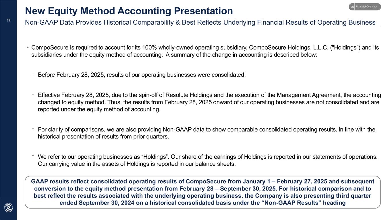 • CompoSecure is required to account for its 100% wholly-owned operating subsidiary, CompoSecure Holdings, L.L.C. ("Holdings") and its subsidiaries under the equity method of accounting. A summary of the change in accounting is described below: Before February 28, 2025, results of our operating businesses were consolidated. Effective February 28, 2025, due to the spin-off of Resolute Holdings and the execution of the Management Agreement, the accounting changed to equity method. Thus, the results from February 28, 2025 onward of our operating businesses are not consolidated and are reported under the equity method of accounting. For clarity of comparisons, we are also providing Non-GAAP data to show comparable consolidated operating results, in line with the historical presentation of results from prior quarters. We refer to our operating businesses as “Holdings”. Our share of the earnings of Holdings is reported in our statements of operations. Our carrying value in the assets of Holdings is reported in our balance sheets. GAAP results reflect consolidated operating results of CompoSecure from January 1 – February 27, 2025 and subsequent conversion to the equity method presentation from February 28 – September 30, 2025. For historical comparison and to best reflect the results associated with the underlying operating business, the Company is also presenting third quarter ended September 30, 2024 on a historical consolidated basis under the “Non-GAAP Results” heading 11 New Equity Method Accounting Presentation _ _ _ _ Non-GAAP Data Provides Historical Comparability & Best Reflects Underlying Financial Results of Operating Business Financial OverviewQ3