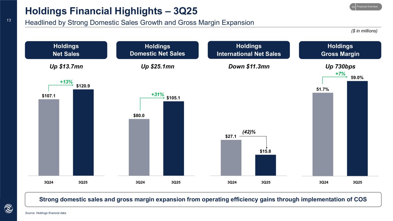12 Significant Year-over-Year Progress Across All Key Reporting Metrics Operating Results Summary – 3Q25 Non-GAAP metrics best reflect operating performance and are consistent with historical presentation less management fee 1 Refers to a Non-GAAP Measure; please reference the Appendix for full reconciliation. 2 For 3Q24, Net Sales, Gross Profit, Gross Margin, and Cash and Cash Equivalents are identical on a GAAP and Non-GAAP basis, because such measures have historically been shown on a consolidated basis. As of September 30, 2025, $97.2 million of cash was held at Holdings and not included in the GAAP results. 3 Pro-Forma Adjusted EBITDA includes $3.7mn and $3.4mn management fee expense in 3Q25 and 3Q24, respectively. It was included as a pro forma adjustment to 3Q24 to allow for comparability across periods. Please reference Statement of Operations on slide 17 for full reconciliation. 4 As of September 30, 2025. 5 As of September 30, 2024. 6 Non-GAAP Total Debt is comprised entirely of debt at Holdings. 7 Investment in U.S. Treasury bills as of September 30, 2025. Net Sales Gross Profit Gross Margin (%) Pro Forma Adjusted EBITDA EPS / Adjusted EPS – Diluted Cash and Cash Equivalents Total Debt Three Months Ended September 30, 2025 GAAP Non-GAAP Three Months Ended September 30, 2024 GAAP Non-GAAP $—mn $120.9mn1 $71.3mn1$—mn 59.0%1—% $47.7mn1 $(1.58) $0.291 $127.4mn $224.6mn1,2,4 $190.0mn4,6 $107.1mn2 $107.1mn1,2 $55.4mn2 $55.4mn1,2 51.7%2 51.7%1,2 $36.6mn1,3 $(1.10) $0.231 $52.7mn2,5 $52.7mn2,5 $330.0mn5,6 Short-Term Investments $—mn $—mn $—mn$40.7mn4,7 Financial OverviewQ3