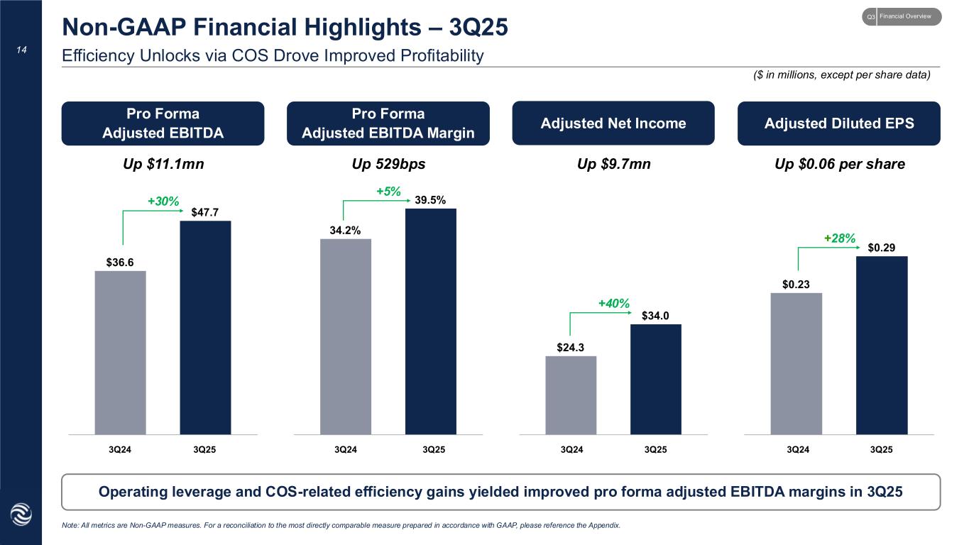 Holdings Net Sales Holdings Gross Margin Holdings International Net Sales Up $13.7mn Up 730bps Down $11.3mn ($ in millions) Holdings Domestic Net Sales Up $25.1mn 13 Headlined by Strong Domestic Sales Growth and Gross Margin Expansion Holdings Financial Highlights – 3Q25 Strong domestic sales and gross margin expansion from operating efficiency gains through implementation of COS +13% +31% (42)% +7% Source: Holdings financial data. 3Q24 3Q24 3Q24 3Q243Q25 3Q25 3Q25 3Q25 Financial OverviewQ3