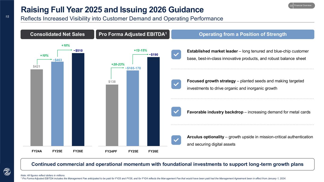 14 Efficiency Unlocks via COS Drove Improved Profitability Non-GAAP Financial Highlights – 3Q25 ($ in millions, except per share data) Pro Forma Adjusted EBITDA Adjusted Diluted EPSAdjusted Net Income Up $11.1mn Up $0.06 per shareUp $9.7mn Pro Forma Adjusted EBITDA Margin Up 529bps Note: All metrics are Non-GAAP measures. For a reconciliation to the most directly comparable measure prepared in accordance with GAAP, please reference the Appendix. Operating leverage and COS-related efficiency gains yielded improved pro forma adjusted EBITDA margins in 3Q25 +5% +40% +28% +30% 3Q24 3Q24 3Q24 3Q243Q25 3Q25 3Q25 3Q25 Financial OverviewQ3