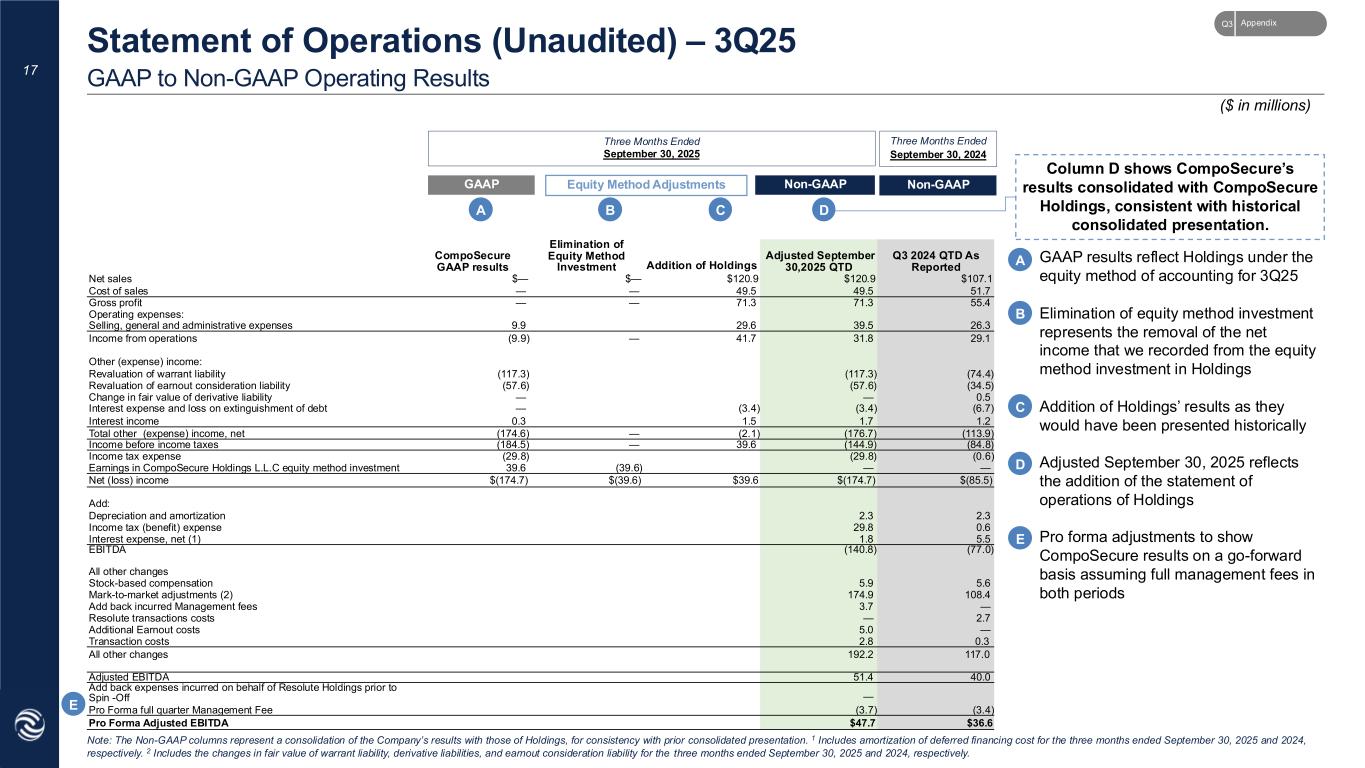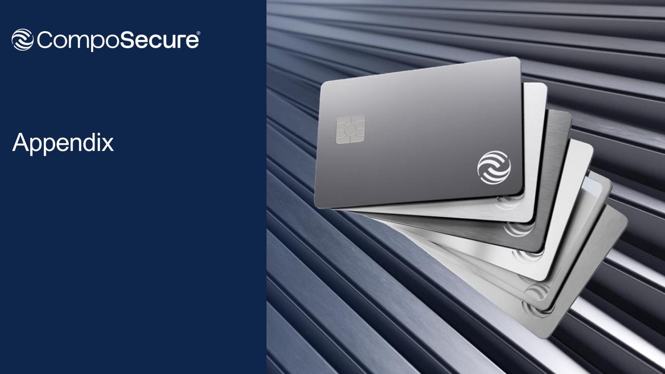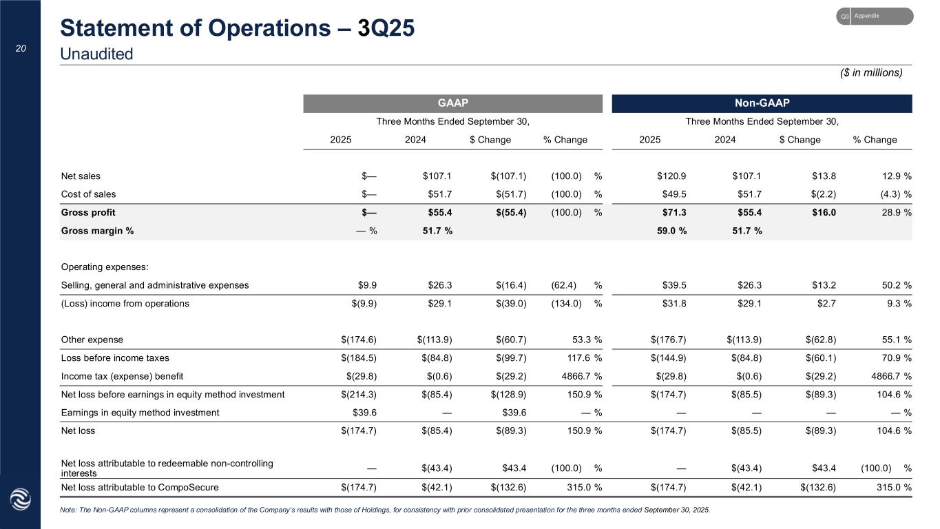 GAAP Non-GAAP Three Months Ended September 30, Three Months Ended September 30, 2025 2024 $ Change % Change 2025 2024 $ Change % Change Net sales $— $107.1 $(107.1) (100.0) % $120.9 $107.1 $13.8 12.9 % Cost of sales $— $51.7 $(51.7) (100.0) % $49.5 $51.7 $(2.2) (4.3) % Gross profit $— $55.4 $(55.4) (100.0) % $71.3 $55.4 $16.0 28.9 % Gross margin % — % 51.7 % 59.0 % 51.7 % Operating expenses: Selling, general and administrative expenses $9.9 $26.3 $(16.4) (62.4) % $39.5 $26.3 $13.2 50.2 % (Loss) income from operations $(9.9) $29.1 $(39.0) (134.0) % $31.8 $29.1 $2.7 9.3 % Other expense $(174.6) $(113.9) $(60.7) 53.3 % $(176.7) $(113.9) $(62.8) 55.1 % Loss before income taxes $(184.5) $(84.8) $(99.7) 117.6 % $(144.9) $(84.8) $(60.1) 70.9 % Income tax (expense) benefit $(29.8) $(0.6) $(29.2) 4866.7 % $(29.8) $(0.6) $(29.2) 4866.7 % Net loss before earnings in equity method investment $(214.3) $(85.4) $(128.9) 150.9 % $(174.7) $(85.5) $(89.3) 104.6 % Earnings in equity method investment $39.6 — $39.6 — % — — — — % Net loss $(174.7) $(85.4) $(89.3) 150.9 % $(174.7) $(85.5) $(89.3) 104.6 % Net loss attributable to redeemable non-controlling interests — $(43.4) $43.4 (100.0) % — $(43.4) $43.4 (100.0) % Net loss attributable to CompoSecure $(174.7) $(42.1) $(132.6) 315.0 % $(174.7) $(42.1) $(132.6) 315.0 % 20 Unaudited Statement of Operations – 3Q25 Note: The Non-GAAP columns represent a consolidation of the Company’s results with those of Holdings, for consistency with prior consolidated presentation for the three months ended September 30, 2025. ($ in millions) AppendixQ3
