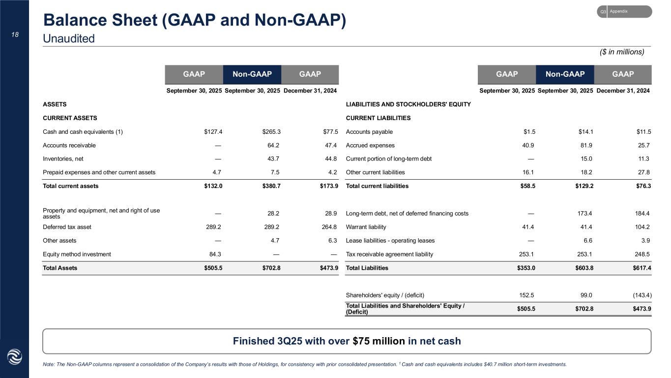 GAAP Non-GAAP GAAP GAAP Non-GAAP GAAP September 30, 2025 September 30, 2025 December 31, 2024 September 30, 2025 September 30, 2025 December 31, 2024 ASSETS LIABILITIES AND STOCKHOLDERS' EQUITY CURRENT ASSETS CURRENT LIABILITIES Cash and cash equivalents (1) $127.4 $265.3 $77.5 Accounts payable $1.5 $14.1 $11.5 Accounts receivable — 64.2 47.4 Accrued expenses 40.9 81.9 25.7 Inventories, net — 43.7 44.8 Current portion of long-term debt — 15.0 11.3 Prepaid expenses and other current assets 4.7 7.5 4.2 Other current liabilities 16.1 18.2 27.8 Total current assets $132.0 $380.7 $173.9 Total current liabilities $58.5 $129.2 $76.3 Property and equipment, net and right of use assets — 28.2 28.9 Long-term debt, net of deferred financing costs — 173.4 184.4 Deferred tax asset 289.2 289.2 264.8 Warrant liability 41.4 41.4 104.2 Other assets — 4.7 6.3 Lease liabilities - operating leases — 6.6 3.9 Equity method investment 84.3 — — Tax receivable agreement liability 253.1 253.1 248.5 Total Assets $505.5 $702.8 $473.9 Total Liabilities $353.0 $603.8 $617.4 Shareholders' equity / (deficit) 152.5 99.0 (143.4) Total Liabilities and Shareholders' Equity / (Deficit) $505.5 $702.8 $473.9 18 Unaudited Balance Sheet (GAAP and Non-GAAP) Finished 3Q25 with over $75 million in net cash ($ in millions) Note: The Non-GAAP columns represent a consolidation of the Company’s results with those of Holdings, for consistency with prior consolidated presentation. 1 Cash and cash equivalents includes $40.7 million short-term investments. AppendixQ3