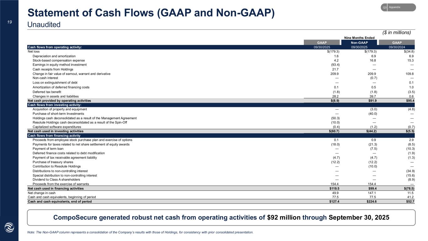 17 GAAP to Non-GAAP Operating Results Statement of Operations (Unaudited) – 3Q25 GAAP results reflect Holdings under the equity method of accounting for 3Q25 Elimination of equity method investment represents the removal of the net income that we recorded from the equity method investment in Holdings Addition of Holdings’ results as they would have been presented historically Adjusted September 30, 2025 reflects the addition of the statement of operations of Holdings Pro forma adjustments to show CompoSecure results on a go-forward basis assuming full management fees in both periods B C D A D Non-GAAPGAAP Non-GAAP Three Months Ended September 30, 2025 Three Months Ended September 30, 2024 Column D shows CompoSecure’s results consolidated with CompoSecure Holdings, consistent with historical consolidated presentation. Equity Method Adjustments ($ in millions) Note: The Non-GAAP columns represent a consolidation of the Company’s results with those of Holdings, for consistency with prior consolidated presentation. 1 Includes amortization of deferred financing cost for the three months ended September 30, 2025 and 2024, respectively. 2 Includes the changes in fair value of warrant liability, derivative liabilities, and earnout consideration liability for the three months ended September 30, 2025 and 2024, respectively. CompoSecure GAAP results Elimination of Equity Method Investment Addition of Holdings Adjusted September 30,2025 QTD Q3 2024 QTD As Reported Net sales $— $— $120.9 $120.9 $107.1 Cost of sales — — 49.5 49.5 51.7 Gross profit — — 71.3 71.3 55.4 Operating expenses: Selling, general and administrative expenses 9.9 29.6 39.5 26.3 Income from operations (9.9) — 41.7 31.8 29.1 Other (expense) income: Revaluation of warrant liability (117.3) (117.3) (74.4) Revaluation of earnout consideration liability (57.6) (57.6) (34.5) Change in fair value of derivative liability — — 0.5 Interest expense and loss on extinguishment of debt — (3.4) (3.4) (6.7) Interest income 0.3 1.5 1.7 1.2 Total other (expense) income, net (174.6) — (2.1) (176.7) (113.9) Income before income taxes (184.5) — 39.6 (144.9) (84.8) Income tax expense (29.8) (29.8) (0.6) Earnings in CompoSecure Holdings L.L.C equity method investment 39.6 (39.6) — — Net (loss) income $(174.7) $(39.6) $39.6 $(174.7) $(85.5) Add: Depreciation and amortization 2.3 2.3 Income tax (benefit) expense 29.8 0.6 Interest expense, net (1) 1.8 5.5 EBITDA (140.8) (77.0) All other changes Stock-based compensation 5.9 5.6 Mark-to-market adjustments (2) 174.9 108.4 Add back incurred Management fees 3.7 — Resolute transactions costs — 2.7 Additional Earnout costs 5.0 — Transaction costs 2.8 0.3 All other changes 192.2 117.0 Adjusted EBITDA 51.4 40.0 Add back expenses incurred on behalf of Resolute Holdings prior to Spin -Off — Pro Forma full quarter Management Fee (3.7) (3.4) Pro Forma Adjusted EBITDA $47.7 $36.6 AppendixQ3 E C B A E