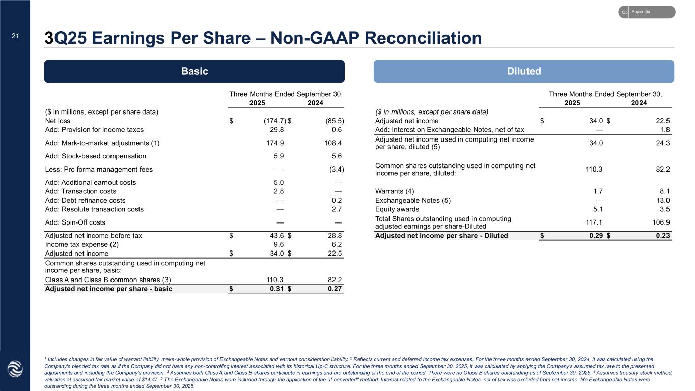 Basic Diluted Three Months Ended September 30, Three Months Ended September 30, 2025 2024 2025 2024 ($ in millions, except per share data) ($ in millions, except per share data) Net loss $ (174.7) $ (85.5) Adjusted net income $ 34.0 $ 22.5 Add: Provision for income taxes 29.8 0.6 Add: Interest on Exchangeable Notes, net of tax — 1.8 Add: Mark-to-market adjustments (1) 174.9 108.4 Adjusted net income used in computing net income per share, diluted (5) 34.0 24.3 Add: Stock-based compensation 5.9 5.6 Less: Pro forma management fees — (3.4) Common shares outstanding used in computing net income per share, diluted: 110.3 82.2 Add: Additional earnout costs 5.0 — Add: Transaction costs 2.8 — Warrants (4) 1.7 8.1 Add: Debt refinance costs — 0.2 Exchangeable Notes (5) — 13.0 Add: Resolute transaction costs — 2.7 Equity awards 5.1 3.5 Add: Spin-Off costs — — Total Shares outstanding used in computing adjusted earnings per share-Diluted 117.1 106.9 Adjusted net income before tax $ 43.6 $ 28.8 Adjusted net income per share - Diluted $ 0.29 $ 0.23 Income tax expense (2) 9.6 6.2 Adjusted net income $ 34.0 $ 22.5 Common shares outstanding used in computing net income per share, basic: Class A and Class B common shares (3) 110.3 82.2 Adjusted net income per share - basic $ 0.31 $ 0.27 21 3Q25 Earnings Per Share – Non-GAAP Reconciliation 1 Includes changes in fair value of warrant liability, make-whole provision of Exchangeable Notes and earnout consideration liability. 2 Reflects current and deferred income tax expenses. For the three months ended September 30, 2024, it was calculated using the Company's blended tax rate as if the Company did not have any non-controlling interest associated with its historical Up-C structure. For the three months ended September 30, 2025, it was calculated by applying the Company's assumed tax rate to the presented adjustments and including the Company's provision. 3 Assumes both Class A and Class B shares participate in earnings and are outstanding at the end of the period. There were no C lass B shares outstanding as of September 30, 2025. 4 Assumes treasury stock method, valuation at assumed fair market value of $14.47. 5 The Exchangeable Notes were included through the application of the "if-converted" method. Interest related to the Exchangeable Notes, net of tax was excluded from net income. No Exchangeable Notes were outstanding during the three months ended September 30, 2025. AppendixQ3