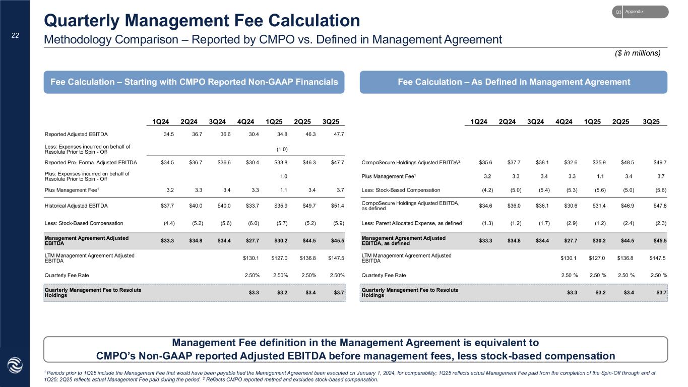 22 Methodology Comparison – Reported by CMPO vs. Defined in Management Agreement Quarterly Management Fee Calculation 1 Periods prior to 1Q25 include the Management Fee that would have been payable had the Management Agreement been executed on January 1, 2024, for comparability; 1Q25 reflects actual Management Fee paid from the completion of the Spin-Off through end of 1Q25; 2Q25 reflects actual Management Fee paid during the period. 2 Reflects CMPO reported method and excludes stock-based compensation. Fee Calculation – Starting with CMPO Reported Non-GAAP Financials Fee Calculation – As Defined in Management Agreement Management Fee definition in the Management Agreement is equivalent to CMPO’s Non-GAAP reported Adjusted EBITDA before management fees, less stock-based compensation ($ in millions) 1Q24 2Q24 3Q24 4Q24 1Q25 2Q25 3Q25 1Q24 2Q24 3Q24 4Q24 1Q25 2Q25 3Q25 Reported Adjusted EBITDA 34.5 36.7 36.6 30.4 34.8 46.3 47.7 Less: Expenses incurred on behalf of Resolute Prior to Spin - Off (1.0) Reported Pro- Forma Adjusted EBITDA $34.5 $36.7 $36.6 $30.4 $33.8 $46.3 $47.7 CompoSecure Holdings Adjusted EBITDA2 $35.6 $37.7 $38.1 $32.6 $35.9 $48.5 $49.7 Plus: Expenses incurred on behalf of Resolute Prior to Spin - Off 1.0 Plus Management Fee1 3.2 3.3 3.4 3.3 1.1 3.4 3.7 Plus Management Fee1 3.2 3.3 3.4 3.3 1.1 3.4 3.7 Less: Stock-Based Compensation (4.2) (5.0) (5.4) (5.3) (5.6) (5.0) (5.6) Historical Adjusted EBITDA $37.7 $40.0 $40.0 $33.7 $35.9 $49.7 $51.4 CompoSecure Holdings Adjusted EBITDA, as defined $34.6 $36.0 $36.1 $30.6 $31.4 $46.9 $47.8 Less: Stock-Based Compensation (4.4) (5.2) (5.6) (6.0) (5.7) (5.2) (5.9) Less: Parent Allocated Expense, as defined (1.3) (1.2) (1.7) (2.9) (1.2) (2.4) (2.3) Management Agreement Adjusted EBITDA $33.3 $34.8 $34.4 $27.7 $30.2 $44.5 $45.5 Management Agreement Adjusted EBITDA, as defined $33.3 $34.8 $34.4 $27.7 $30.2 $44.5 $45.5 LTM Management Agreement Adjusted EBITDA $130.1 $127.0 $136.8 $147.5 LTM Management Agreement Adjusted EBITDA $130.1 $127.0 $136.8 $147.5 Quarterly Fee Rate 2.50% 2.50% 2.50% 2.50% Quarterly Fee Rate 2.50 % 2.50 % 2.50 % 2.50 % Quarterly Management Fee to Resolute Holdings $3.3 $3.2 $3.4 $3.7 Quarterly Management Fee to Resolute Holdings $3.3 $3.2 $3.4 $3.7 AppendixQ3