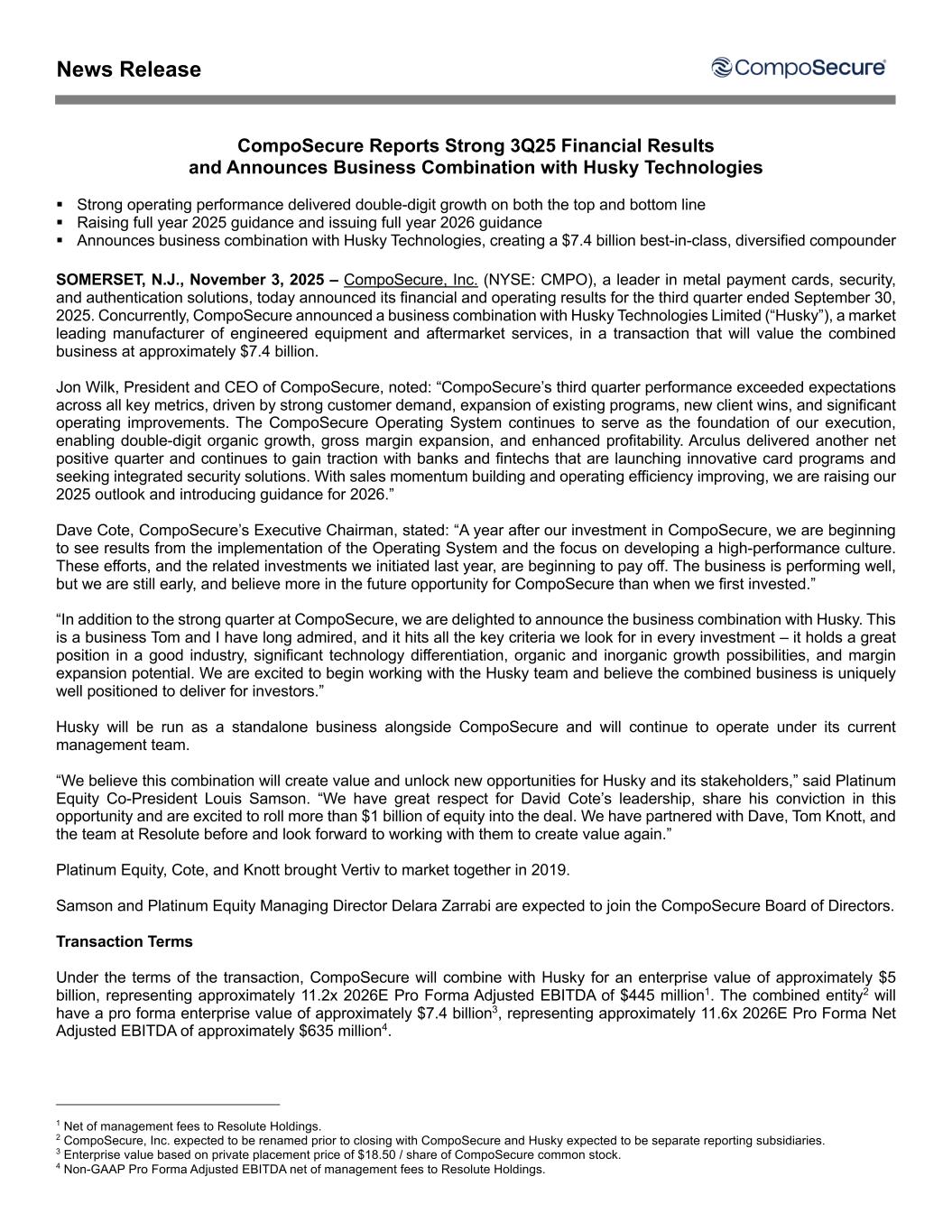 News Release CompoSecure Reports Strong 3Q25 Financial Results and Announces Business Combination with Husky Technologies § Strong operating performance delivered double-digit growth on both the top and bottom line § Raising full year 2025 guidance and issuing full year 2026 guidance § Announces business combination with Husky Technologies, creating a $7.4 billion best-in-class, diversified compounder SOMERSET, N.J., November 3, 2025 – CompoSecure, Inc. (NYSE: CMPO), a leader in metal payment cards, security, and authentication solutions, today announced its financial and operating results for the third quarter ended September 30, 2025. Concurrently, CompoSecure announced a business combination with Husky Technologies Limited (“Husky”), a market leading manufacturer of engineered equipment and aftermarket services, in a transaction that will value the combined business at approximately $7.4 billion. Jon Wilk, President and CEO of CompoSecure, noted: “CompoSecure’s third quarter performance exceeded expectations across all key metrics, driven by strong customer demand, expansion of existing programs, new client wins, and significant operating improvements. The CompoSecure Operating System continues to serve as the foundation of our execution, enabling double-digit organic growth, gross margin expansion, and enhanced profitability. Arculus delivered another net positive quarter and continues to gain traction with banks and fintechs that are launching innovative card programs and seeking integrated security solutions. With sales momentum building and operating efficiency improving, we are raising our 2025 outlook and introducing guidance for 2026.” Dave Cote, CompoSecure’s Executive Chairman, stated: “A year after our investment in CompoSecure, we are beginning to see results from the implementation of the Operating System and the focus on developing a high-performance culture. These efforts, and the related investments we initiated last year, are beginning to pay off. The business is performing well, but we are still early, and believe more in the future opportunity for CompoSecure than when we first invested.” “In addition to the strong quarter at CompoSecure, we are delighted to announce the business combination with Husky. This is a business Tom and I have long admired, and it hits all the key criteria we look for in every investment – it holds a great position in a good industry, significant technology differentiation, organic and inorganic growth possibilities, and margin expansion potential. We are excited to begin working with the Husky team and believe the combined business is uniquely well positioned to deliver for investors.” Husky will be run as a standalone business alongside CompoSecure and will continue to operate under its current management team. “We believe this combination will create value and unlock new opportunities for Husky and its stakeholders,” said Platinum Equity Co-President Louis Samson. “We have great respect for David Cote’s leadership, share his conviction in this opportunity and are excited to roll more than $1 billion of equity into the deal. We have partnered with Dave, Tom Knott, and the team at Resolute before and look forward to working with them to create value again.” Platinum Equity, Cote, and Knott brought Vertiv to market together in 2019. Samson and Platinum Equity Managing Director Delara Zarrabi are expected to join the CompoSecure Board of Directors. Transaction Terms Under the terms of the transaction, CompoSecure will combine with Husky for an enterprise value of approximately $5 billion, representing approximately 11.2x 2026E Pro Forma Adjusted EBITDA of $445 million1. The combined entity2 will have a pro forma enterprise value of approximately $7.4 billion3, representing approximately 11.6x 2026E Pro Forma Net Adjusted EBITDA of approximately $635 million4. 1 Net of management fees to Resolute Holdings. 2 CompoSecure, Inc. expected to be renamed prior to closing with CompoSecure and Husky expected to be separate reporting subsidiaries. 3 Enterprise value based on private placement price of $18.50 / share of CompoSecure common stock. 4 Non-GAAP Pro Forma Adjusted EBITDA net of management fees to Resolute Holdings.