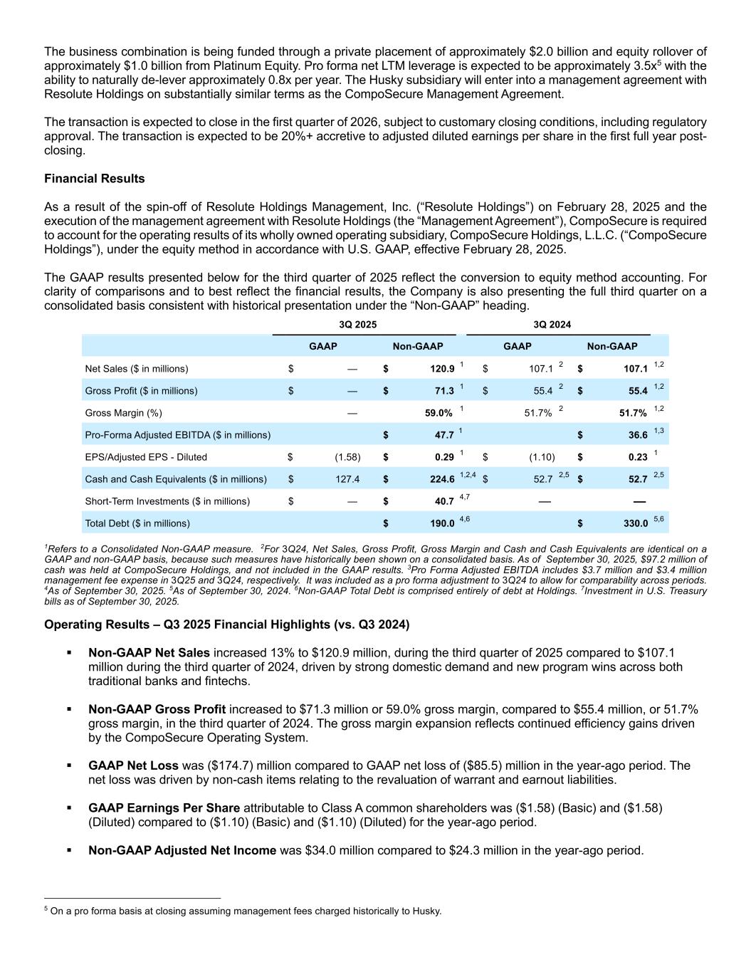 The business combination is being funded through a private placement of approximately $2.0 billion and equity rollover of approximately $1.0 billion from Platinum Equity. Pro forma net LTM leverage is expected to be approximately 3.5x5 with the ability to naturally de-lever approximately 0.8x per year. The Husky subsidiary will enter into a management agreement with Resolute Holdings on substantially similar terms as the CompoSecure Management Agreement. The transaction is expected to close in the first quarter of 2026, subject to customary closing conditions, including regulatory approval. The transaction is expected to be 20%+ accretive to adjusted diluted earnings per share in the first full year post- closing. Financial Results As a result of the spin-off of Resolute Holdings Management, Inc. (“Resolute Holdings”) on February 28, 2025 and the execution of the management agreement with Resolute Holdings (the “Management Agreement”), CompoSecure is required to account for the operating results of its wholly owned operating subsidiary, CompoSecure Holdings, L.L.C. (“CompoSecure Holdings”), under the equity method in accordance with U.S. GAAP, effective February 28, 2025. The GAAP results presented below for the third quarter of 2025 reflect the conversion to equity method accounting. For clarity of comparisons and to best reflect the financial results, the Company is also presenting the full third quarter on a consolidated basis consistent with historical presentation under the “Non-GAAP” heading. 3Q 2025 3Q 2024 GAAP Non-GAAP GAAP Non-GAAP Net Sales ($ in millions) $ — $ 120.9 1 $ 107.1 2 $ 107.1 1,2 Gross Profit ($ in millions) $ — $ 71.3 1 $ 55.4 2 $ 55.4 1,2 Gross Margin (%) — 59.0% 1 51.7% 2 51.7% 1,2 Pro-Forma Adjusted EBITDA ($ in millions) $ 47.7 1 $ 36.6 1,3 EPS/Adjusted EPS - Diluted $ (1.58) $ 0.29 1 $ (1.10) $ 0.23 1 Cash and Cash Equivalents ($ in millions) $ 127.4 $ 224.6 1,2,4 $ 52.7 2,5 $ 52.7 2,5 Short-Term Investments ($ in millions) $ — $ 40.7 4,7 — — Total Debt ($ in millions) $ 190.0 4,6 $ 330.0 5,6 1Refers to a Consolidated Non-GAAP measure. 2For 3Q24, Net Sales, Gross Profit, Gross Margin and Cash and Cash Equivalents are identical on a GAAP and non-GAAP basis, because such measures have historically been shown on a consolidated basis. As of September 30, 2025, $97.2 million of cash was held at CompoSecure Holdings, and not included in the GAAP results. 3Pro Forma Adjusted EBITDA includes $3.7 million and $3.4 million management fee expense in 3Q25 and 3Q24, respectively. It was included as a pro forma adjustment to 3Q24 to allow for comparability across periods. 4As of September 30, 2025. 5As of September 30, 2024. 6Non-GAAP Total Debt is comprised entirely of debt at Holdings. 7Investment in U.S. Treasury bills as of September 30, 2025. Operating Results – Q3 2025 Financial Highlights (vs. Q3 2024) § Non-GAAP Net Sales increased 13% to $120.9 million, during the third quarter of 2025 compared to $107.1 million during the third quarter of 2024, driven by strong domestic demand and new program wins across both traditional banks and fintechs. § Non-GAAP Gross Profit increased to $71.3 million or 59.0% gross margin, compared to $55.4 million, or 51.7% gross margin, in the third quarter of 2024. The gross margin expansion reflects continued efficiency gains driven by the CompoSecure Operating System. § GAAP Net Loss was ($174.7) million compared to GAAP net loss of ($85.5) million in the year-ago period. The net loss was driven by non-cash items relating to the revaluation of warrant and earnout liabilities. § GAAP Earnings Per Share attributable to Class A common shareholders was ($1.58) (Basic) and ($1.58) (Diluted) compared to ($1.10) (Basic) and ($1.10) (Diluted) for the year-ago period. § Non-GAAP Adjusted Net Income was $34.0 million compared to $24.3 million in the year-ago period. 5 On a pro forma basis at closing assuming management fees charged historically to Husky.