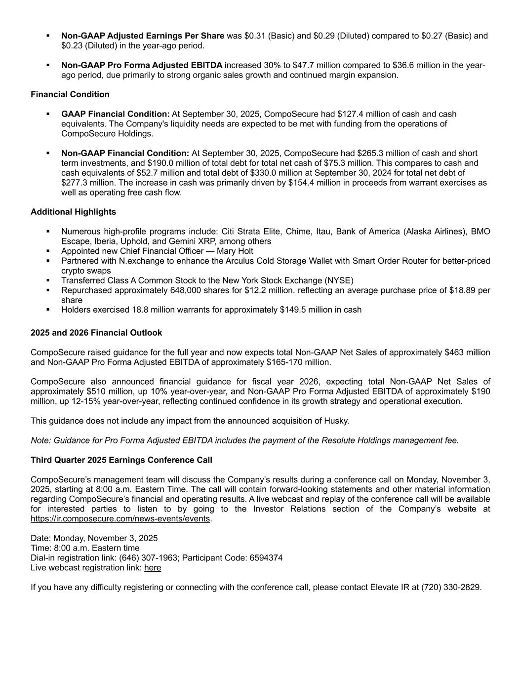 § Non-GAAP Adjusted Earnings Per Share was $0.31 (Basic) and $0.29 (Diluted) compared to $0.27 (Basic) and $0.23 (Diluted) in the year-ago period. § Non-GAAP Pro Forma Adjusted EBITDA increased 30% to $47.7 million compared to $36.6 million in the year- ago period, due primarily to strong organic sales growth and continued margin expansion. Financial Condition § GAAP Financial Condition: At September 30, 2025, CompoSecure had $127.4 million of cash and cash equivalents. The Company's liquidity needs are expected to be met with funding from the operations of CompoSecure Holdings. § Non-GAAP Financial Condition: At September 30, 2025, CompoSecure had $265.3 million of cash and short term investments, and $190.0 million of total debt for total net cash of $75.3 million. This compares to cash and cash equivalents of $52.7 million and total debt of $330.0 million at September 30, 2024 for total net debt of $277.3 million. The increase in cash was primarily driven by $154.4 million in proceeds from warrant exercises as well as operating free cash flow. Additional Highlights § Numerous high-profile programs include: Citi Strata Elite, Chime, Itau, Bank of America (Alaska Airlines), BMO Escape, Iberia, Uphold, and Gemini XRP, among others § Appointed new Chief Financial Officer — Mary Holt § Partnered with N.exchange to enhance the Arculus Cold Storage Wallet with Smart Order Router for better-priced crypto swaps § Transferred Class A Common Stock to the New York Stock Exchange (NYSE) § Repurchased approximately 648,000 shares for $12.2 million, reflecting an average purchase price of $18.89 per share § Holders exercised 18.8 million warrants for approximately $149.5 million in cash 2025 and 2026 Financial Outlook CompoSecure raised guidance for the full year and now expects total Non-GAAP Net Sales of approximately $463 million and Non-GAAP Pro Forma Adjusted EBITDA of approximately $165-170 million. CompoSecure also announced financial guidance for fiscal year 2026, expecting total Non-GAAP Net Sales of approximately $510 million, up 10% year-over-year, and Non-GAAP Pro Forma Adjusted EBITDA of approximately $190 million, up 12-15% year-over-year, reflecting continued confidence in its growth strategy and operational execution. This guidance does not include any impact from the announced acquisition of Husky. Note: Guidance for Pro Forma Adjusted EBITDA includes the payment of the Resolute Holdings management fee. Third Quarter 2025 Earnings Conference Call CompoSecure’s management team will discuss the Company’s results during a conference call on Monday, November 3, 2025, starting at 8:00 a.m. Eastern Time. The call will contain forward-looking statements and other material information regarding CompoSecure’s financial and operating results. A live webcast and replay of the conference call will be available for interested parties to listen to by going to the Investor Relations section of the Company’s website at https://ir.composecure.com/news-events/events. Date: Monday, November 3, 2025 Time: 8:00 a.m. Eastern time Dial-in registration link: (646) 307-1963; Participant Code: 6594374 Live webcast registration link: here If you have any difficulty registering or connecting with the conference call, please contact Elevate IR at (720) 330-2829.