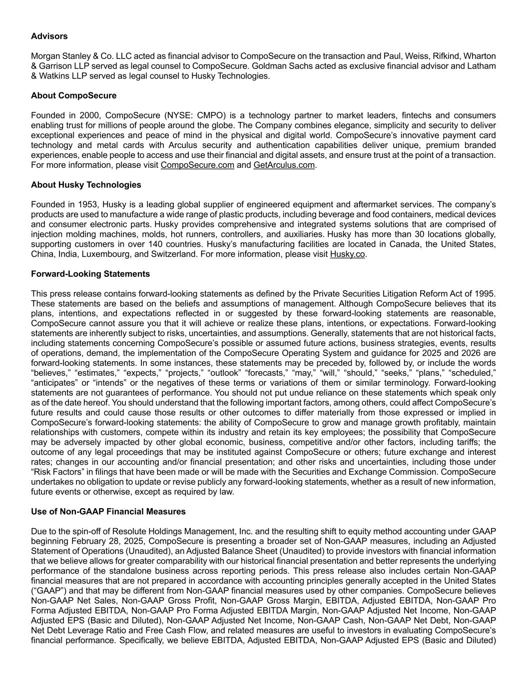 Advisors Morgan Stanley & Co. LLC acted as financial advisor to CompoSecure on the transaction and Paul, Weiss, Rifkind, Wharton & Garrison LLP served as legal counsel to CompoSecure. Goldman Sachs acted as exclusive financial advisor and Latham & Watkins LLP served as legal counsel to Husky Technologies. About CompoSecure Founded in 2000, CompoSecure (NYSE: CMPO) is a technology partner to market leaders, fintechs and consumers enabling trust for millions of people around the globe. The Company combines elegance, simplicity and security to deliver exceptional experiences and peace of mind in the physical and digital world. CompoSecure’s innovative payment card technology and metal cards with Arculus security and authentication capabilities deliver unique, premium branded experiences, enable people to access and use their financial and digital assets, and ensure trust at the point of a transaction. For more information, please visit CompoSecure.com and GetArculus.com. About Husky Technologies Founded in 1953, Husky is a leading global supplier of engineered equipment and aftermarket services. The company’s products are used to manufacture a wide range of plastic products, including beverage and food containers, medical devices and consumer electronic parts. Husky provides comprehensive and integrated systems solutions that are comprised of injection molding machines, molds, hot runners, controllers, and auxiliaries. Husky has more than 30 locations globally, supporting customers in over 140 countries. Husky’s manufacturing facilities are located in Canada, the United States, China, India, Luxembourg, and Switzerland. For more information, please visit Husky.co. Forward-Looking Statements This press release contains forward-looking statements as defined by the Private Securities Litigation Reform Act of 1995. These statements are based on the beliefs and assumptions of management. Although CompoSecure believes that its plans, intentions, and expectations reflected in or suggested by these forward-looking statements are reasonable, CompoSecure cannot assure you that it will achieve or realize these plans, intentions, or expectations. Forward-looking statements are inherently subject to risks, uncertainties, and assumptions. Generally, statements that are not historical facts, including statements concerning CompoSecure’s possible or assumed future actions, business strategies, events, results of operations, demand, the implementation of the CompoSecure Operating System and guidance for 2025 and 2026 are forward-looking statements. In some instances, these statements may be preceded by, followed by, or include the words “believes,” “estimates,” “expects,” “projects,” “outlook” “forecasts,” “may,” “will,” “should,” “seeks,” “plans,” “scheduled,” “anticipates” or “intends” or the negatives of these terms or variations of them or similar terminology. Forward-looking statements are not guarantees of performance. You should not put undue reliance on these statements which speak only as of the date hereof. You should understand that the following important factors, among others, could affect CompoSecure’s future results and could cause those results or other outcomes to differ materially from those expressed or implied in CompoSecure’s forward-looking statements: the ability of CompoSecure to grow and manage growth profitably, maintain relationships with customers, compete within its industry and retain its key employees; the possibility that CompoSecure may be adversely impacted by other global economic, business, competitive and/or other factors, including tariffs; the outcome of any legal proceedings that may be instituted against CompoSecure or others; future exchange and interest rates; changes in our accounting and/or financial presentation; and other risks and uncertainties, including those under “Risk Factors” in filings that have been made or will be made with the Securities and Exchange Commission. CompoSecure undertakes no obligation to update or revise publicly any forward-looking statements, whether as a result of new information, future events or otherwise, except as required by law. Use of Non-GAAP Financial Measures Due to the spin-off of Resolute Holdings Management, Inc. and the resulting shift to equity method accounting under GAAP beginning February 28, 2025, CompoSecure is presenting a broader set of Non-GAAP measures, including an Adjusted Statement of Operations (Unaudited), an Adjusted Balance Sheet (Unaudited) to provide investors with financial information that we believe allows for greater comparability with our historical financial presentation and better represents the underlying performance of the standalone business across reporting periods. This press release also includes certain Non-GAAP financial measures that are not prepared in accordance with accounting principles generally accepted in the United States (“GAAP”) and that may be different from Non-GAAP financial measures used by other companies. CompoSecure believes Non-GAAP Net Sales, Non-GAAP Gross Profit, Non-GAAP Gross Margin, EBITDA, Adjusted EBITDA, Non-GAAP Pro Forma Adjusted EBITDA, Non-GAAP Pro Forma Adjusted EBITDA Margin, Non-GAAP Adjusted Net Income, Non-GAAP Adjusted EPS (Basic and Diluted), Non-GAAP Adjusted Net Income, Non-GAAP Cash, Non-GAAP Net Debt, Non-GAAP Net Debt Leverage Ratio and Free Cash Flow, and related measures are useful to investors in evaluating CompoSecure’s financial performance. Specifically, we believe EBITDA, Adjusted EBITDA, Non-GAAP Adjusted EPS (Basic and Diluted)