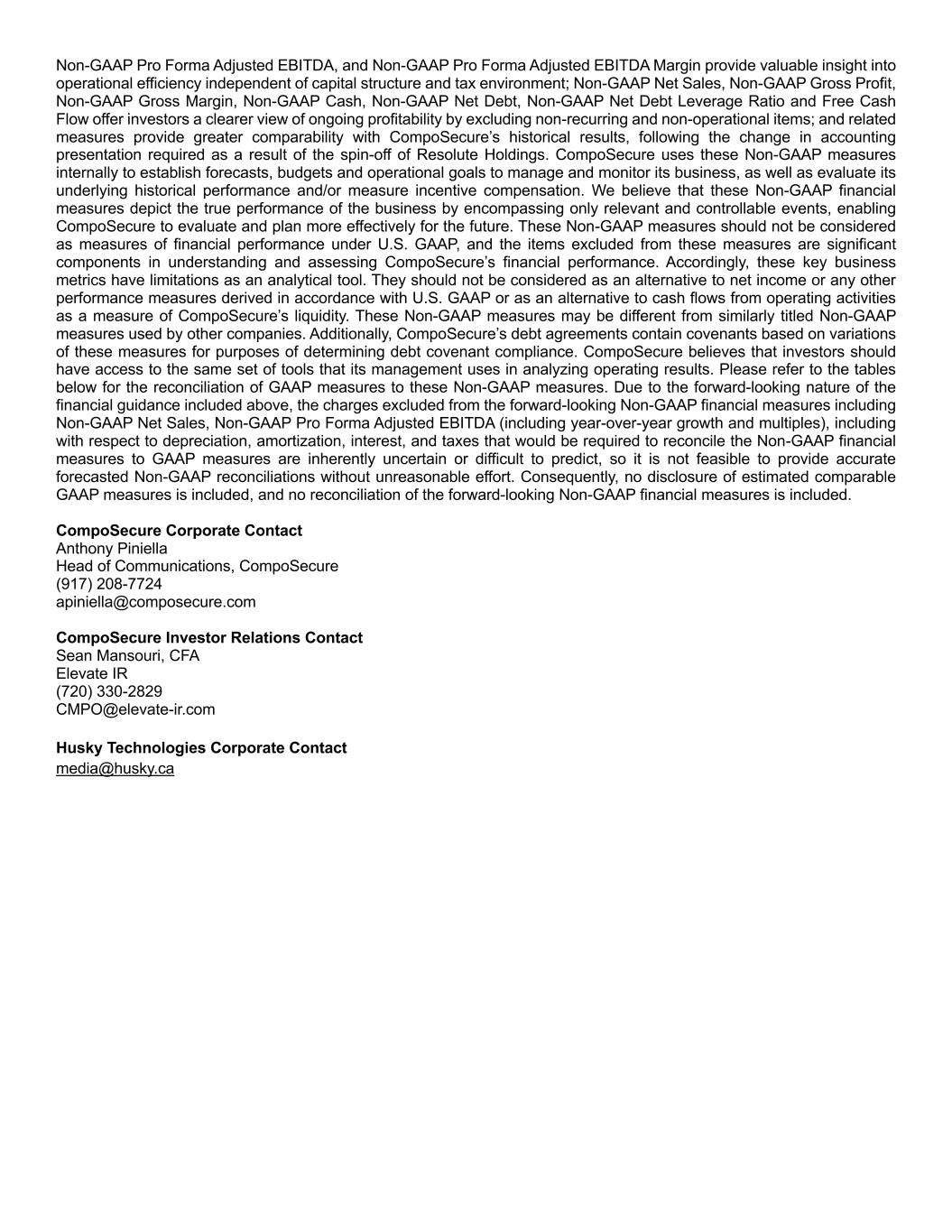 Non-GAAP Pro Forma Adjusted EBITDA, and Non-GAAP Pro Forma Adjusted EBITDA Margin provide valuable insight into operational efficiency independent of capital structure and tax environment; Non-GAAP Net Sales, Non-GAAP Gross Profit, Non-GAAP Gross Margin, Non-GAAP Cash, Non-GAAP Net Debt, Non-GAAP Net Debt Leverage Ratio and Free Cash Flow offer investors a clearer view of ongoing profitability by excluding non-recurring and non-operational items; and related measures provide greater comparability with CompoSecure’s historical results, following the change in accounting presentation required as a result of the spin-off of Resolute Holdings. CompoSecure uses these Non-GAAP measures internally to establish forecasts, budgets and operational goals to manage and monitor its business, as well as evaluate its underlying historical performance and/or measure incentive compensation. We believe that these Non-GAAP financial measures depict the true performance of the business by encompassing only relevant and controllable events, enabling CompoSecure to evaluate and plan more effectively for the future. These Non-GAAP measures should not be considered as measures of financial performance under U.S. GAAP, and the items excluded from these measures are significant components in understanding and assessing CompoSecure’s financial performance. Accordingly, these key business metrics have limitations as an analytical tool. They should not be considered as an alternative to net income or any other performance measures derived in accordance with U.S. GAAP or as an alternative to cash flows from operating activities as a measure of CompoSecure’s liquidity. These Non-GAAP measures may be different from similarly titled Non-GAAP measures used by other companies. Additionally, CompoSecure’s debt agreements contain covenants based on variations of these measures for purposes of determining debt covenant compliance. CompoSecure believes that investors should have access to the same set of tools that its management uses in analyzing operating results. Please refer to the tables below for the reconciliation of GAAP measures to these Non-GAAP measures. Due to the forward-looking nature of the financial guidance included above, the charges excluded from the forward-looking Non-GAAP financial measures including Non-GAAP Net Sales, Non-GAAP Pro Forma Adjusted EBITDA (including year-over-year growth and multiples), including with respect to depreciation, amortization, interest, and taxes that would be required to reconcile the Non-GAAP financial measures to GAAP measures are inherently uncertain or difficult to predict, so it is not feasible to provide accurate forecasted Non-GAAP reconciliations without unreasonable effort. Consequently, no disclosure of estimated comparable GAAP measures is included, and no reconciliation of the forward-looking Non-GAAP financial measures is included. CompoSecure Corporate Contact Anthony Piniella Head of Communications, CompoSecure (917) 208-7724 apiniella@composecure.com CompoSecure Investor Relations Contact Sean Mansouri, CFA Elevate IR (720) 330-2829 CMPO@elevate-ir.com Husky Technologies Corporate Contact media@husky.ca