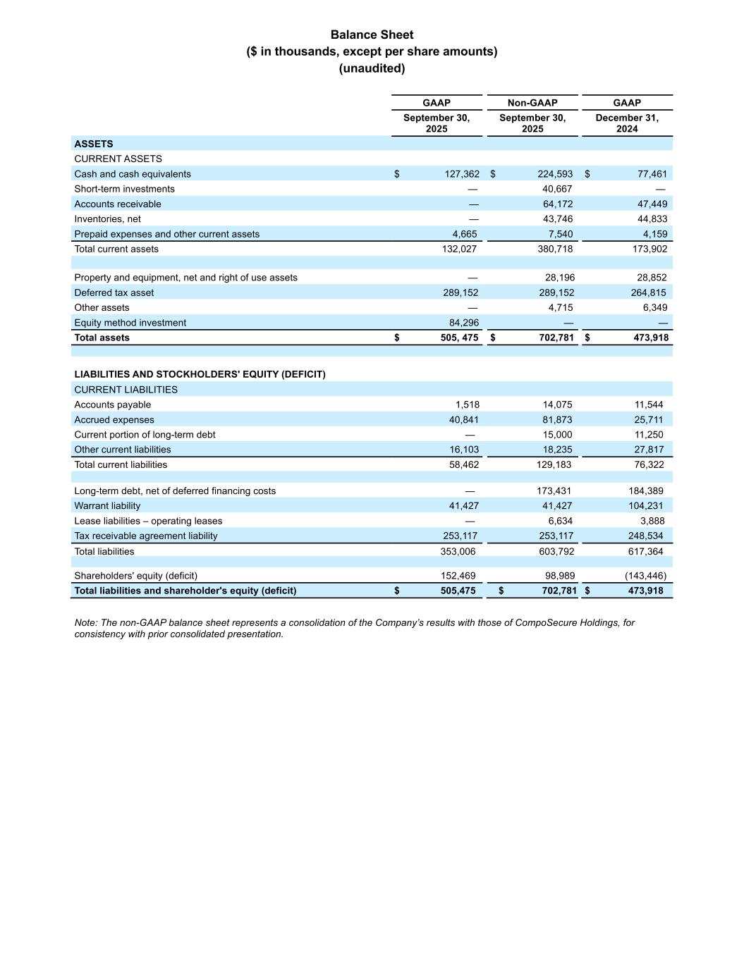 Balance Sheet ($ in thousands, except per share amounts) (unaudited) GAAP Non-GAAP GAAP September 30, 2025 September 30, 2025 December 31, 2024 ASSETS CURRENT ASSETS Cash and cash equivalents $ 127,362 $ 224,593 $ 77,461 Short-term investments — 40,667 — Accounts receivable — 64,172 47,449 Inventories, net — 43,746 44,833 Prepaid expenses and other current assets 4,665 7,540 4,159 Total current assets 132,027 380,718 173,902 Property and equipment, net and right of use assets — 28,196 28,852 Deferred tax asset 289,152 289,152 264,815 Other assets — 4,715 6,349 Equity method investment 84,296 — — Total assets $ 505, 475 $ 702,781 $ 473,918 LIABILITIES AND STOCKHOLDERS' EQUITY (DEFICIT) CURRENT LIABILITIES Accounts payable 1,518 14,075 11,544 Accrued expenses 40,841 81,873 25,711 Current portion of long-term debt — 15,000 11,250 Other current liabilities 16,103 18,235 27,817 Total current liabilities 58,462 129,183 76,322 Long-term debt, net of deferred financing costs — 173,431 184,389 Warrant liability 41,427 41,427 104,231 Lease liabilities – operating leases — 6,634 3,888 Tax receivable agreement liability 253,117 253,117 248,534 Total liabilities 353,006 603,792 617,364 Shareholders' equity (deficit) 152,469 98,989 (143,446) Total liabilities and shareholder's equity (deficit) $ 505,475 $ 702,781 $ 473,918 Note: The non-GAAP balance sheet represents a consolidation of the Company’s results with those of CompoSecure Holdings, for consistency with prior consolidated presentation.
