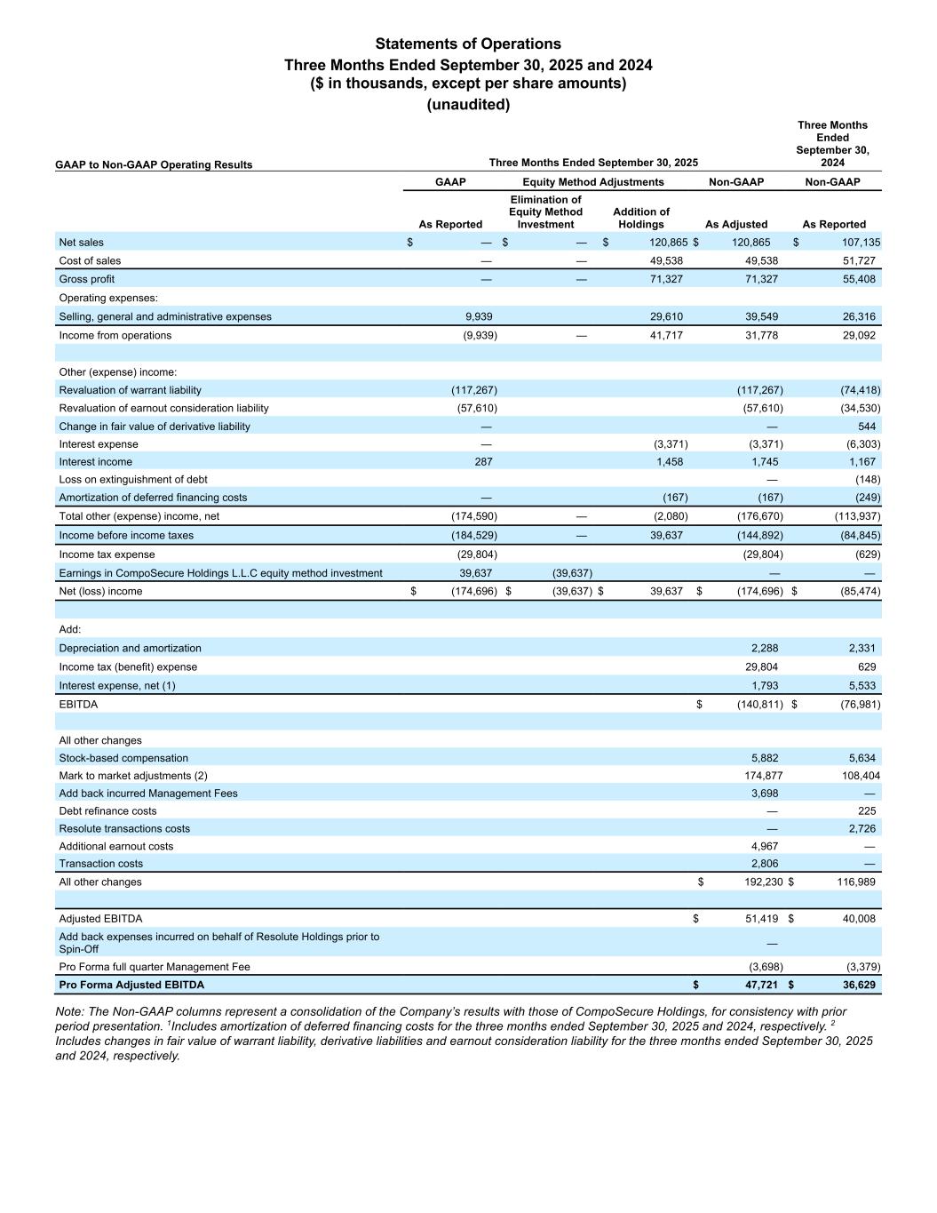 Statements of Operations Three Months Ended September 30, 2025 and 2024 ($ in thousands, except per share amounts) (unaudited) GAAP to Non-GAAP Operating Results Three Months Ended September 30, 2025 Three Months Ended September 30, 2024 GAAP Equity Method Adjustments Non-GAAP Non-GAAP As Reported Elimination of Equity Method Investment Addition of Holdings As Adjusted As Reported Net sales $ — $ — $ 120,865 $ 120,865 $ 107,135 Cost of sales — — 49,538 49,538 51,727 Gross profit — — 71,327 71,327 55,408 Operating expenses: Selling, general and administrative expenses 9,939 29,610 39,549 26,316 Income from operations (9,939) — 41,717 31,778 29,092 Other (expense) income: Revaluation of warrant liability (117,267) (117,267) (74,418) Revaluation of earnout consideration liability (57,610) (57,610) (34,530) Change in fair value of derivative liability — — 544 Interest expense — (3,371) (3,371) (6,303) Interest income 287 1,458 1,745 1,167 Loss on extinguishment of debt — (148) Amortization of deferred financing costs — (167) (167) (249) Total other (expense) income, net (174,590) — (2,080) (176,670) (113,937) Income before income taxes (184,529) — 39,637 (144,892) (84,845) Income tax expense (29,804) (29,804) (629) Earnings in CompoSecure Holdings L.L.C equity method investment 39,637 (39,637) — — Net (loss) income $ (174,696) $ (39,637) $ 39,637 $ (174,696) $ (85,474) Add: Depreciation and amortization 2,288 2,331 Income tax (benefit) expense 29,804 629 Interest expense, net (1) 1,793 5,533 EBITDA $ (140,811) $ (76,981) All other changes Stock-based compensation 5,882 5,634 Mark to market adjustments (2) 174,877 108,404 Add back incurred Management Fees 3,698 — Debt refinance costs — 225 Resolute transactions costs — 2,726 Additional earnout costs 4,967 — Transaction costs 2,806 — All other changes $ 192,230 $ 116,989 Adjusted EBITDA $ 51,419 $ 40,008 Add back expenses incurred on behalf of Resolute Holdings prior to Spin-Off — Pro Forma full quarter Management Fee (3,698) (3,379) Pro Forma Adjusted EBITDA $ 47,721 $ 36,629 Note: The Non-GAAP columns represent a consolidation of the Company’s results with those of CompoSecure Holdings, for consistency with prior period presentation. 1Includes amortization of deferred financing costs for the three months ended September 30, 2025 and 2024, respectively. 2 Includes changes in fair value of warrant liability, derivative liabilities and earnout consideration liability for the three months ended September 30, 2025 and 2024, respectively.