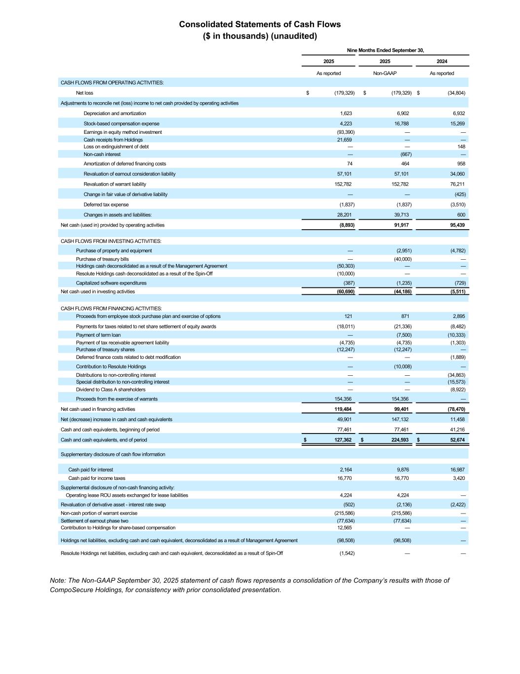 Consolidated Statements of Cash Flows ($ in thousands) (unaudited) Note: The Non-GAAP September 30, 2025 statement of cash flows represents a consolidation of the Company’s results with those of CompoSecure Holdings, for consistency with prior consolidated presentation. Nine Months Ended September 30, 2025 2025 2024 As reported Non-GAAP As reported CASH FLOWS FROM OPERATING ACTIVITIES: Net loss $ (179,329) $ (179,329) $ (34,804) Adjustments to reconcile net (loss) income to net cash provided by operating activities Depreciation and amortization 1,623 6,902 6,932 Stock-based compensation expense 4,223 16,788 15,269 Earnings in equity method investment (93,390) — — Cash receipts from Holdings 21,659 — — Loss on extinguishment of debt — — 148 Non-cash interest — (667) — Amortization of deferred financing costs 74 464 958 Revaluation of earnout consideration liability 57,101 57,101 34,060 Revaluation of warrant liability 152,782 152,782 76,211 Change in fair value of derivative liability — — (425) Deferred tax expense (1,837) (1,837) (3,510) Changes in assets and liabilities: 28,201 39,713 600 Net cash (used in) provided by operating activities (8,893) 91,917 95,439 CASH FLOWS FROM INVESTING ACTIVITIES: Purchase of property and equipment — (2,951) (4,782) Purchase of treasury bills — (40,000) — Holdings cash deconsolidated as a result of the Management Agreement (50,303) — — Resolute Holdings cash deconsolidated as a result of the Spin-Off (10,000) — — Capitalized software expenditures (387) (1,235) (729) Net cash used in investing activities (60,690) (44,186) (5,511) CASH FLOWS FROM FINANCING ACTIVITIES: Proceeds from employee stock purchase plan and exercise of options 121 871 2,895 Payments for taxes related to net share settlement of equity awards (18,011) (21,336) (8,482) Payment of term loan — (7,500) (10,333) Payment of tax receivable agreement liability (4,735) (4,735) (1,303) Purchase of treasury shares (12,247) (12,247) — Deferred finance costs related to debt modification — — (1,889) Contribution to Resolute Holdings — (10,008) — Distributions to non-controlling interest — — (34,863) Special distribution to non-controlling interest — — (15,573) Dividend to Class A shareholders — — (8,922) Proceeds from the exercise of warrants 154,356 154,356 — Net cash used in financing activities 119,484 99,401 (78,470) Net (decrease) increase in cash and cash equivalents 49,901 147,132 11,458 Cash and cash equivalents, beginning of period 77,461 77,461 41,216 Cash and cash equivalents, end of period $ 127,362 $ 224,593 $ 52,674 Supplementary disclosure of cash flow information Cash paid for interest 2,164 9,876 16,987 Cash paid for income taxes 16,770 16,770 3,420 Supplemental disclosure of non-cash financing activity: Operating lease ROU assets exchanged for lease liabilities 4,224 4,224 — Revaluation of derivative asset - interest rate swap (502) (2,136) (2,422) Non-cash portion of warrant exercise (215,586) (215,586) — Settlement of earnout phase two (77,634) (77,634) — Contribution to Holdings for share-based compensation 12,565 — — Holdings net liabilities, excluding cash and cash equivalent, deconsolidated as a result of Management Agreement (98,508) (98,508) — Resolute Holdings net liabilities, excluding cash and cash equivalent, deconsolidated as a result of Spin-Off (1,542) — —