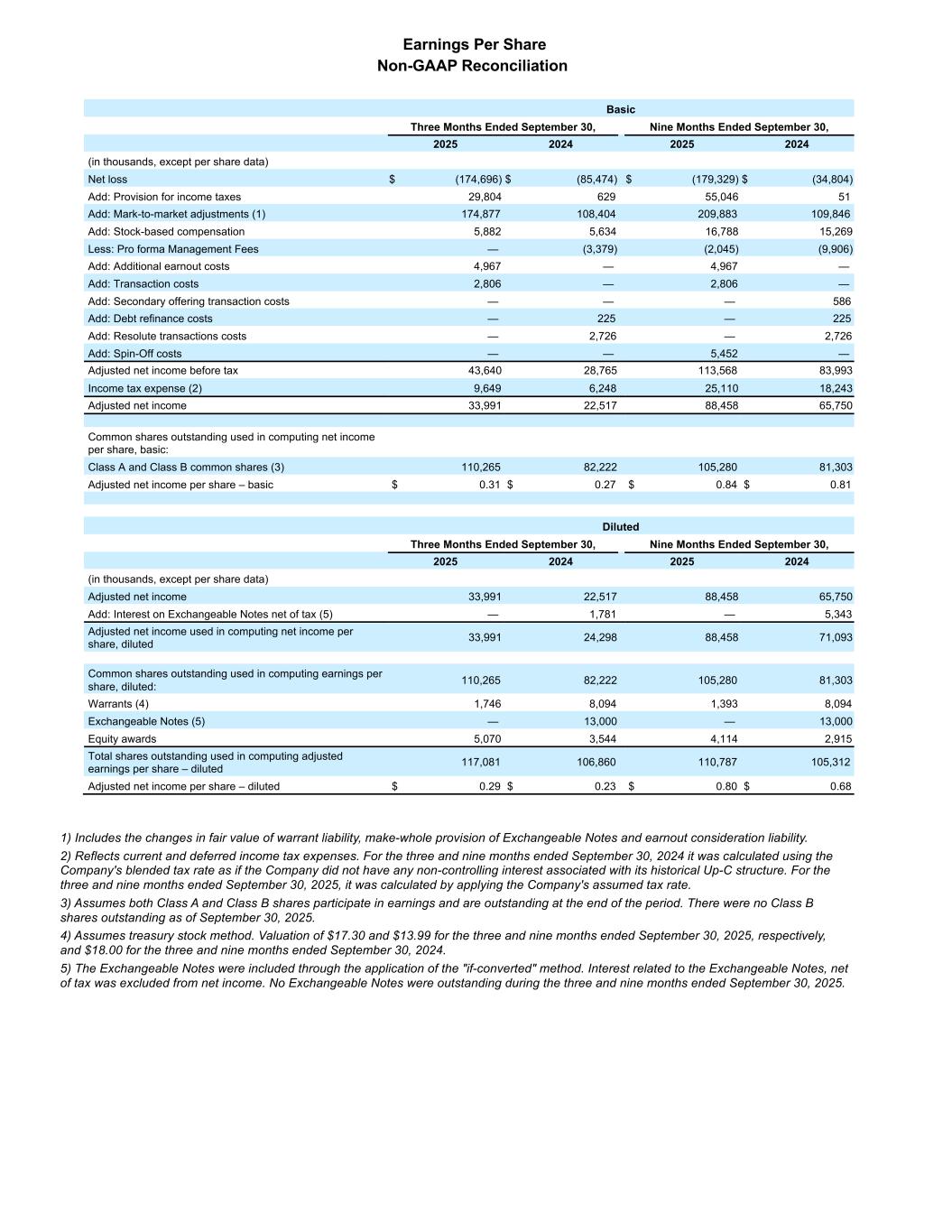 Earnings Per Share Non-GAAP Reconciliation Basic Three Months Ended September 30, Nine Months Ended September 30, 2025 2024 2025 2024 (in thousands, except per share data) Net loss $ (174,696) $ (85,474) $ (179,329) $ (34,804) Add: Provision for income taxes 29,804 629 55,046 51 Add: Mark-to-market adjustments (1) 174,877 108,404 209,883 109,846 Add: Stock-based compensation 5,882 5,634 16,788 15,269 Less: Pro forma Management Fees — (3,379) (2,045) (9,906) Add: Additional earnout costs 4,967 — 4,967 — Add: Transaction costs 2,806 — 2,806 — Add: Secondary offering transaction costs — — — 586 Add: Debt refinance costs — 225 — 225 Add: Resolute transactions costs — 2,726 — 2,726 Add: Spin-Off costs — — 5,452 — Adjusted net income before tax 43,640 28,765 113,568 83,993 Income tax expense (2) 9,649 6,248 25,110 18,243 Adjusted net income 33,991 22,517 88,458 65,750 Common shares outstanding used in computing net income per share, basic: Class A and Class B common shares (3) 110,265 82,222 105,280 81,303 Adjusted net income per share – basic $ 0.31 $ 0.27 $ 0.84 $ 0.81 Diluted Three Months Ended September 30, Nine Months Ended September 30, 2025 2024 2025 2024 (in thousands, except per share data) Adjusted net income 33,991 22,517 88,458 65,750 Add: Interest on Exchangeable Notes net of tax (5) — 1,781 — 5,343 Adjusted net income used in computing net income per share, diluted 33,991 24,298 88,458 71,093 Common shares outstanding used in computing earnings per share, diluted: 110,265 82,222 105,280 81,303 Warrants (4) 1,746 8,094 1,393 8,094 Exchangeable Notes (5) — 13,000 — 13,000 Equity awards 5,070 3,544 4,114 2,915 Total shares outstanding used in computing adjusted earnings per share – diluted 117,081 106,860 110,787 105,312 Adjusted net income per share – diluted $ 0.29 $ 0.23 $ 0.80 $ 0.68 1) Includes the changes in fair value of warrant liability, make-whole provision of Exchangeable Notes and earnout consideration liability. 2) Reflects current and deferred income tax expenses. For the three and nine months ended September 30, 2024 it was calculated using the Company's blended tax rate as if the Company did not have any non-controlling interest associated with its historical Up-C structure. For the three and nine months ended September 30, 2025, it was calculated by applying the Company's assumed tax rate. 3) Assumes both Class A and Class B shares participate in earnings and are outstanding at the end of the period. There were no Class B shares outstanding as of September 30, 2025. 4) Assumes treasury stock method. Valuation of $17.30 and $13.99 for the three and nine months ended September 30, 2025, respectively, and $18.00 for the three and nine months ended September 30, 2024. 5) The Exchangeable Notes were included through the application of the "if-converted" method. Interest related to the Exchangeable Notes, net of tax was excluded from net income. No Exchangeable Notes were outstanding during the three and nine months ended September 30, 2025.