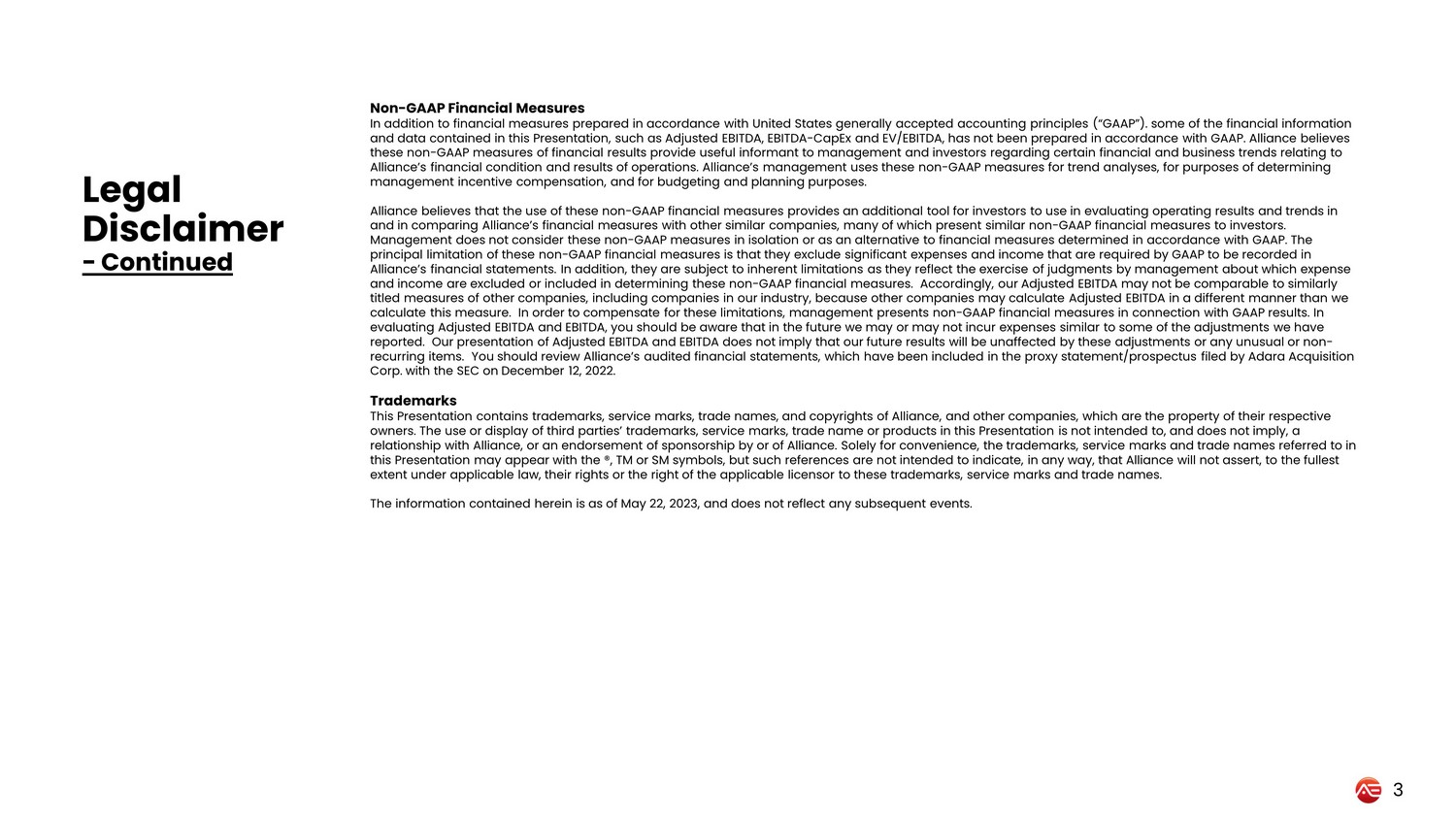 Legal Disclaimer - Continued 3 Non - GAAP Financial Measures In addition to financial measures prepared in accordance with United States generally accepted accounting principles (“GAAP”) . s ome of the financial information and data contained in this Presentation, such as Adjusted EBITDA, EBITDA - CapEx and EV/EBITDA, has not been prepared in accordanc e with GAAP. Alliance believes these non - GAAP measures of financial results provide useful informant to management and investors regarding certain financial an d business trends relating to Alliance’s financial condition and results of operations. Alliance’s management uses these non - GAAP measures for trend analyses, for purposes of determining management incentive compensation, and for budgeting and planning purposes. Alliance believes that the use of these non - GAAP financial measures provides an additional tool for investors to use in evaluati ng operating results and trends in and in comparing Alliance’s financial measures with other similar companies, many of which present similar non - GAAP financial me asures to investors. Management does not consider these non - GAAP measures in isolation or as an alternative to financial measures determined in accor dance with GAAP. The principal limitation of these non - GAAP financial measures is that they exclude significant expenses and income that are required by GAAP to be recorded in Alliance’s financial statements. In addition, they are subject to inherent limitations as they reflect the exercise of judgme nts by management about which expense and income are excluded or included in determining these non - GAAP financial measures. Accordingly, our Adjusted EBITDA may not be comparable to similarly titled measures of other companies, including companies in our industry, because other companies may calculate Adjusted EBITD A i n a different manner than we calculate this measure. In order to compensate for these limitations, management presents non - GAAP financial measures in connec tion with GAAP results. In evaluating Adjusted EBITDA and EBITDA, you should be aware that in the future we may or may not incur expenses similar to som e o f the adjustments we have reported. Our presentation of Adjusted EBITDA and EBITDA does not imply that our future results will be unaffected by these adj ustments or any unusual or non - recurring items. You should review Alliance’s audited financial statements, which have been included in the proxy statement/ pro spectus filed by Adara Acquisition Corp. with the SEC on December 12, 2022. Trademarks This Presentation contains trademarks, service marks, trade names, and copyrights of Alliance, and other companies, which are th e property of their respective owners. The use or display of third parties’ trademarks, service marks, trade name or products in this Presentation is not in ten ded to, and does not imply, a relationship with Alliance, or an endorsement of sponsorship by or of Alliance. Solely for convenience, the trademarks, servi ce marks and trade names referred to in this Presentation may appear with the ®, TM or SM symbols, but such references are not intended to indicate, in any way, that Al liance will not assert, to the fullest extent under applicable law, their rights or the right of the applicable licensor to these trademarks, service marks and trad e n ames. The information contained herein is as of May 22, 2023, and does not reflect any subsequent events.