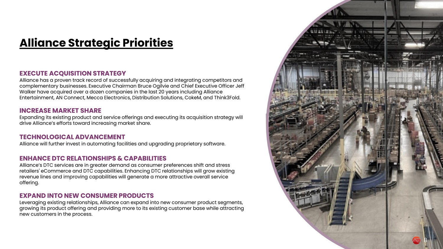 Growth History 2013 Music & Video Distribution • Super D acquires Alliance Entertainment becoming the largest music and video distributor • The first major step in consolidating the 3 main packaged media categories. Super D rebrands to Alliance Entertainment post acquisition 2016 Music & VMI • AN Connect Acquisition • Walmart & Best Buy accounts added • Vendor Managed Inventory system and software systems acquired, providing Alliance with a critical addition to its service offering 2018 Gaming • Mecca Acquisition • Microsoft, Sony, and Nintendo suppliers added • Alliance enters the gaming space, expanding its already diverse physical media product offering 2018 Video Exclusive Distribution • Distribution Solutions Acquisition • Walmart, Amazon, Target, and Best Buy Video Movie Supplier Numbers added • 20 exclusive video distribution studios acquired 2020 Gaming • COKeM Acquisition • Walmart, Best Buy, Target, GameStop, Kohls, and Costco accounts added • Alliances adds the leading gaming distributor with significant store and DTC sales 2022 Toys & Collectibles • Think 3Fold Acquisition • Walmart expansion • Alliance adds collectible toys with 4 feet of shelf space in 3,900 Walmart stores 2023 Public Listing • Adara Acquisition Corp. • Alliance consummates merger with Adara and De - SPACs to become publicly traded company 7