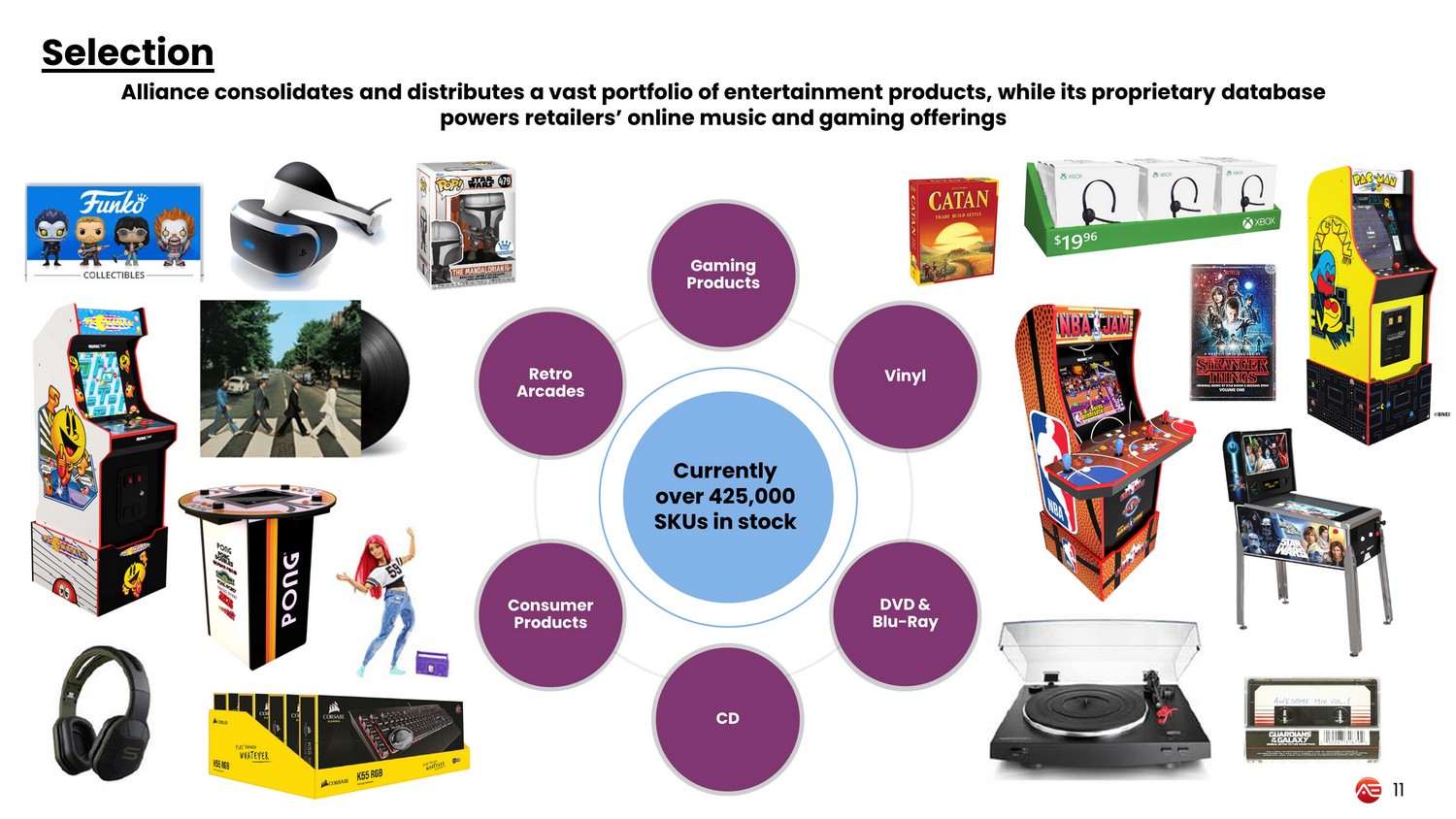 Alliance consolidates and distributes a vast portfolio of entertainment products, while its proprietary database powers retailers’ online music and gaming offerings Gaming Products DVD & Blu - Ray CD Consumer Products Currently over 425,000 SKUs in stock Selection Vinyl Retro Arcades 11