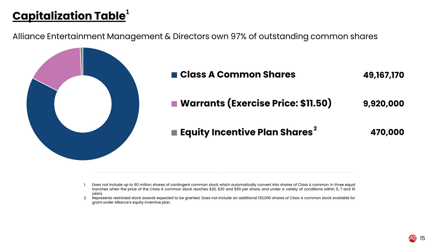 470,000 Capitalization Table 1 Alliance Entertainment Management & Directors own 97% of outstanding common shares 15 Class A Common Shares Warrants (Exercise Price: $11.50) Equity Incentive Plan Shares 2 49,167,170 9,920,000 1. Does not include up to 60 million shares of contingent common stock which automatically convert into shares of Class A common in three equal tranches when the price of the Class A common stock reaches $ 20 , $ 30 and $ 50 per share, and under a variety of conditions within 5 , 7 and 10 years . 2. Represents restricted stock awards expected to be granted . Does not include an additional 130 , 000 shares of Class A common stock available for grant under Alliance’s equity inventive plan .