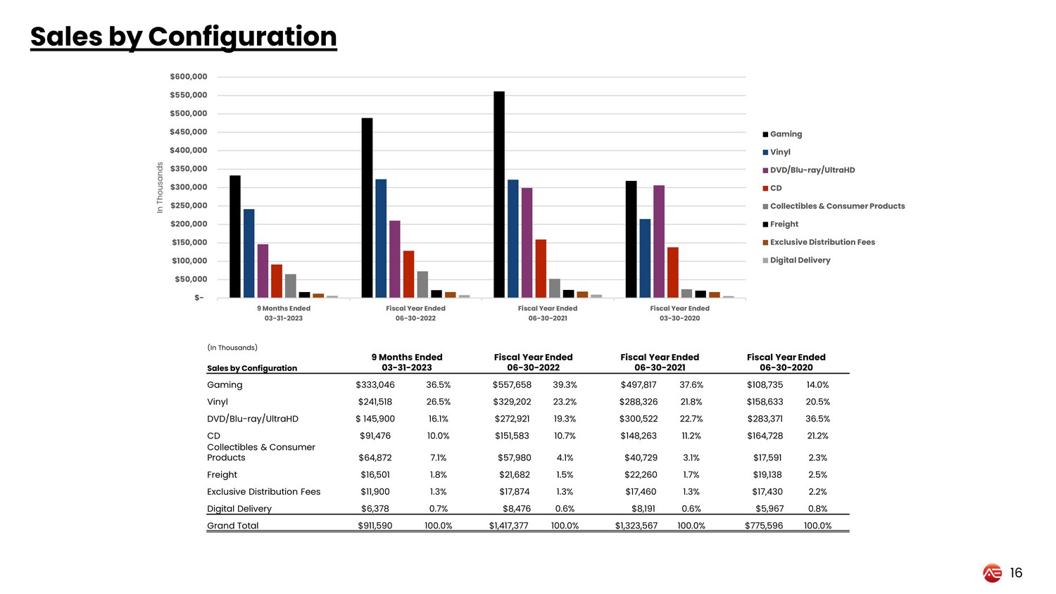 Sales by Configuration 16 (In Thousands) Sales by Configuration 9 Months Ended 03 - 31 - 2023 Fiscal Year Ended 06 - 30 - 2022 Fiscal Year Ended 06 - 30 - 2021 Fiscal Year Ended 06 - 30 - 2020 Gaming $333,046 36.5% $557,658 39.3% $497,817 37.6% $108,735 14.0% Vinyl $241,518 26.5% $329,202 23.2% $288,326 21.8% $158,633 20.5% DVD/Blu - ray/UltraHD $ 145,900 16.1% $272,921 19.3% $300,522 22.7% $283,371 36.5% CD $91,476 10.0% $151,583 10.7% $148,263 11.2% $164,728 21.2% Collectibles & Consumer Products $64,872 7.1% $57,980 4.1% $40,729 3.1% $17,591 2.3% Freight $16,501 1.8% $21,682 1.5% $22,260 1.7% $19,138 2.5% Exclusive Distribution Fees $11,900 1.3% $17,874 1.3% $17,460 1.3% $17,430 2.2% Digital Delivery $6,378 0.7% $8,476 0.6% $8,191 0.6% $5,967 0.8% Grand Total $911,590 100.0% $1,417,377 100.0% $1,323,567 100.0% $775,596 100.0% $- $50,000 $100,000 $150,000 $200,000 $250,000 $300,000 $350,000 $400,000 $450,000 $500,000 $550,000 $600,000 9 Months Ended 03-31-2023 Fiscal Year Ended 06-30-2022 Fiscal Year Ended 06-30-2021 Fiscal Year Ended 03-30-2020 In Thousands Gaming Vinyl DVD/Blu-ray/UltraHD CD Collectibles & Consumer Products Freight Exclusive Distribution Fees Digital Delivery