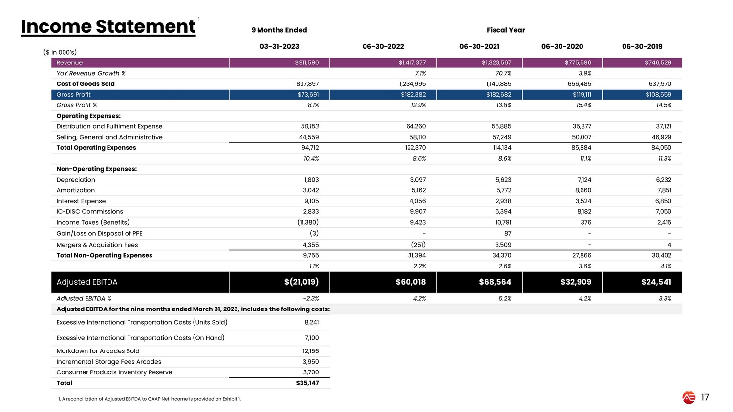 9 Months Ended Fiscal Year 03 - 31 - 2023 06 - 30 - 2022 06 - 30 - 2021 06 - 30 - 2020 06 - 30 - 2019 Revenue $911,590 $1,417,377 $1,323,567 $775,596 $746,529 YoY Revenue Growth % 7.1% 70.7% 3.9% Cost of Goods Sold 837,897 1,234,995 1,140,885 656,485 637,970 Gross Profit $73,691 $182,382 $182,682 $119,111 $108,559 Gross Profit % 8.1% 12.9% 13.8% 15.4% 14.5% Operating Expenses: Distribution and Fulfilment Expense 50,153 64,260 56,885 35,877 37,121 Selling, General and Administrative 44,559 58,110 57,249 50,007 46,929 Total Operating Expenses 94,712 122,370 114,134 85,884 84,050 10.4% 8.6% 8.6% 11.1% 11.3% Non - Operating Expenses: Depreciation 1,803 3,097 5,623 7,124 6,232 Amortization 3,042 5,162 5,772 8,660 7,851 Interest Expense 9,105 4,056 2,938 3,524 6,850 IC - DISC Commissions 2,833 9,907 5,394 8,182 7,050 Income Taxes (Benefits) (11,380) 9,423 10,791 376 2,415 Gain/Loss on Disposal of PPE (3) - 87 - - Mergers & Acquisition Fees 4,355 (251) 3,509 - 4 Total Non - Operating Expenses 9,755 31,394 34,370 27,866 30,402 1.1% 2.2% 2.6% 3.6% 4.1% Adjusted EBITDA $(21,019) $60,018 $68,564 $32,909 $24,541 Adjusted EBITDA % - 2.3% 4.2% 5.2% 4.2% 3.3% Adjusted EBITDA for the nine months ended March 31, 2023, includes the following costs: Excessive International Transportation Costs (Units Sold) 8,241 Excessive International Transportation Costs (On Hand) 7,100 Markdown for Arcades Sold 12,156 Incremental Storage Fees Arcades 3,950 Consumer Products Inventory Reserve 3,700 Total $35,147 17 Income Statement ($ in 000’s) 1. A reconciliation of Adjusted EBITDA to GAAP Net Income is provided on Exhibit 1. 1