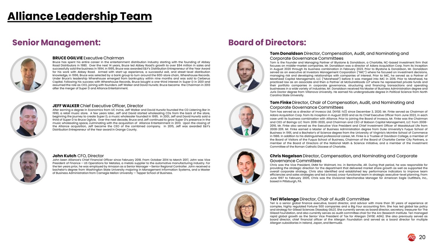 BRUCE OGILVIE Executive Chairman Bruce has spent his entire career in the entertainment distribution industry starting with the founding of Abbey Road Distributors in 1980 . Over the next 14 years, Bruce led Abbey Road’s growth to over $ 94 million in sales and successfully sold the business in 1994 . In 1995 , Bruce was awarded E&Y’s Distribution Entrepreneur of the Year Award for his work with Abbey Road . Armed with start - up experience, a successful exit, and street - level distribution knowledge, in 1996 , Bruce was selected by a bank group to turn around the 600 - store chain, Wherehouse Records . Under Bruce’s leadership Wherehouse emerged from bankruptcy within nine months and was sold to Cerberus Capital . Following his success with Wherehouse Records, Bruce bought a one - third interest in Super D in 2001 and assumed the role as CEO, joining with founders Jeff Walker and David Hurwitz . Bruce became the Chairman in 2013 after the merger of Super D and Alliance Entertainment . Tom Finke Director, Chair of Compensation, Audit, and Nominating and Corporate Governance Committees Tom has served as a director of Invesco Ltd . (NYSE : IVZ) since December 3 , 2020 . Mr . Finke served as Chairman of Adara Acquisition Corp . from its inception in August 2020 and as its Chief Executive Officer from June 2022 , in each case until its business combination with Alliance . Prior to joining the Board of Invesco, Mr . Finke was the Chairman and CEO of Barings LLC from 2016 - 2020 , and Chairman and CEO of Babson Capital Management, LLC from 2008 - 2016 . Mr . Finke also served as the Executive Vice President and Chief Investment Officer of MassMutual Life from 2008 - 2011 . Mr . Finke earned a Master of Business Administration degree from Duke University’s Fuqua School of Business in 1991 , and a Bachelor’s of Science degree from the University of Virginia’s McIntire School of Commerce in 1986 . In addition to his distinguished professional career, Mr . Finke is a Trustee of Davidson College, a member of the Board of Visitors of the Fuqua School of Business, Chairman of the Board of Charlotte Center City Partners, a member of the Board of Directors of the National Math & Science Initiative, and a member of the Investment Committee of the Roman Catholic Diocese of Charlotte . Alliance Leadership Team 20 JEFF WALKER Chief Executive Officer, Director After earning a degree in Economics from UC Irvine, Jeff Walker and David Hurwitz founded the CD Listening Bar in 1990 , a retail music store . A few years later, Jeff and David started wholesaling CDs from the back of the store, beginning the journey to create Super D, a music wholesaler founded in 1995 . In 2001 , Jeff and David Hurwitz sold a third of Super D to Bruce Ogilvie . Over the next decade, Bruce and Jeff continued to grow Super D’s presence in the music wholesaling space, culminating with the acquisition of Alliance Entertainment in 2013 . Upon the closing of the Alliance acquisition, Jeff became the CEO of the combined company . In 2015 , Jeff was awarded E&Y’s Distribution Entrepreneur of the Year award in Orange County . Tom Donaldson Director, Compensation, Audit, and Nominating and Corporate Governance Committees Tom is the Founder and Managing Partner of Blystone & Donaldson, a Charlotte, NC - based investment firm that focuses on middle - market companies . Mr . Donaldson was a director of Adara Acquisition Corp . from its inception in August 2020 through its business combination in February 2023 . Prior to Blystone & Donaldson, Mr . Donaldson served as an executive at Investors Management Corporation (“IMC”) where he focused on investment decisions, managing risk and developing relationships with companies of interest . Prior to IMC, he served as a Partner of Morehead Capital Management, LLC (“Morehead”) before it was merged into IMC in 2016 . Prior to Morehead, he practiced law as an associate and then a Partner at McGuireWoods LLP where he represented private funds and their portfolio companies in corporate governance, structuring and financing transactions and operating businesses in a wide variety of industries . Mr . Donaldson received his Master of Business Administration degree and Juris Doctor degree from Villanova University . He earned his undergraduate degree in Political Science from North Carolina State University . Teri Wielenga Director, Chair of Audit Committee Teri is a senior global finance executive, board director, and advisor with more than 30 years of experience at complex, highly regulated Fortune 500 companies and a Big Four accounting firm . She has led global tax policy and strategy for Gilead Sciences (Nasdaq : GILD) . She currently serves as board director, secretary, treasurer for The Gilead Foundation, and also currently serves as audit committee chair for the Arc Research Institute . Teri managed rapid global growth as the Senior Vice President of Tax for Allergan (NYSE : AGN) . She also previously served as board director, chief financial officer of the Allergan Foundation and served as a board director for multiple Allergan subsidiaries in Ireland, Japan, and Bermuda . Chris Nagelson Director, Compensation, and Nominating and Corporate Governance Committees Chris was the Vice President, DMM for Walmart, Inc . in Bentonville, AR . During that period, he was responsible for providing the strategic direction for the department that delivered market share growth as well as supported the overall corporate strategy . Chris also identified and established key performance indicators to improve team efficiencies and sales strategies and led a broad, cross - functional team in strategic executive - level planning . From June 1997 to February 2005 , Chris was the Divisional Merchandise Manager for American Eagle Outfitters, Inc . , based in Pittsburgh, PA . John Kutch CFO, Director John been Alliance’s Chief Financial Officer since February 2018 . From October 2014 to March 2017 , J