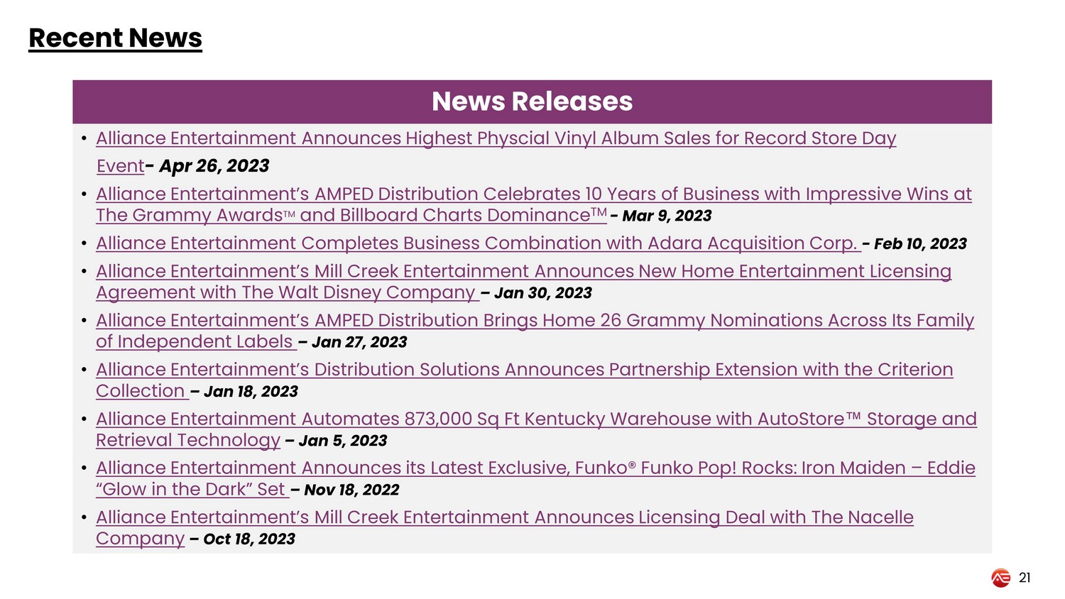 Recent News 21 News Releases • Alliance Entertainment Announces Highest Physcial Vinyl Album Sales for Record Store Day Event - Apr 26, 2023 • Alliance Entertainment’s AMPED Distribution Celebrates 10 Years of Business with Impressive Wins at The Grammy Awards TM and Billboard Charts Dominance TM - Mar 9, 2023 • Alliance Entertainment Completes Business Combination with Adara Acquisition Corp. - Feb 10, 2023 • Alliance Entertainment’s Mill Creek Entertainment Announces New Home Entertainment Licensing Agreement with The Walt Disney Company – Jan 30, 2023 • Alliance Entertainment’s AMPED Distribution Brings Home 26 Grammy Nominations Across Its Family of Independent Labels – Jan 27, 2023 • Alliance Entertainment’s Distribution Solutions Announces Partnership Extension with the Criterion Collection – Jan 18, 2023 • Alliance Entertainment Automates 873,000 Sq Ft Kentucky Warehouse with AutoStore Œ Storage and Retrieval Technology – Jan 5, 2023 • Alliance Entertainment Announces its Latest Exclusive, Funko® Funko Pop! Rocks: Iron Maiden – Eddie “Glow in the Dark” Set – Nov 18, 2022 • Alliance Entertainment’s Mill Creek Entertainment Announces Licensing Deal with The Nacelle Company – Oct 18, 2023