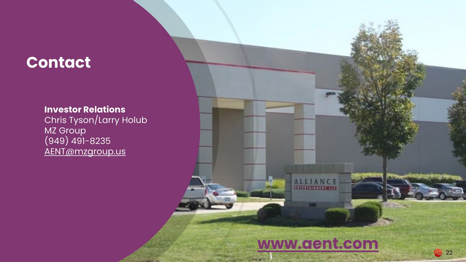Contact Investor Relations Chris Tyson/Larry Holub MZ Group ( 949 ) 491 - 8235 AENT@mzgroup . us www.aent.com 22