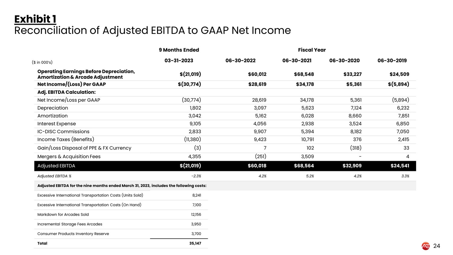 Exhibit 1 Reconciliation of Adjusted EBITDA to GAAP Net Income 9 Months Ended Fiscal Year 03 - 31 - 2023 06 - 30 - 2022 06 - 30 - 2021 06 - 30 - 2020 06 - 30 - 2019 Operating Earnings Before Depreciation, Amortization & Arcade Adjustment $(21,019) $60,012 $68,548 $33,227 $24,509 Net Income/(Loss) Per GAAP $(30,774) $28,619 $34,178 $5,361 $(5,894) Adj. EBITDA Calculation: Net Income/Loss per GAAP (30,774) 28,619 34,178 5,361 (5,894) Depreciation 1,802 3,097 5,623 7,124 6,232 Amortization 3,042 5,162 6,028 8,660 7,851 Interest Expense 9,105 4,056 2,938 3,524 6,850 IC - DISC Commissions 2,833 9,907 5,394 8,182 7,050 Income Taxes (Benefits) (11,380) 9,423 10,791 376 2,415 Gain/Loss Disposal of PPE & FX Currency (3) 7 102 (318) 33 Mergers & Acquisition Fees 4,355 (251) 3,509 - 4 Adjusted EBITDA $(21,019) $60,018 $68,564 $32,909 $24,541 Adjusted EBITDA % - 2.3% 4.2% 5.2% 4.2% 3.3% Adjusted EBITDA for the nine months ended March 31, 2023, includes the following costs: Excessive International Transportation Costs (Units Sold) 8,241 Excessive International Transportation Costs (On Hand) 7,100 Markdown for Arcades Sold 12,156 Incremental Storage Fees Arcades 3,950 Consumer Products Inventory Reserve 3,700 Total 35,147 24 ($ in 000’s )